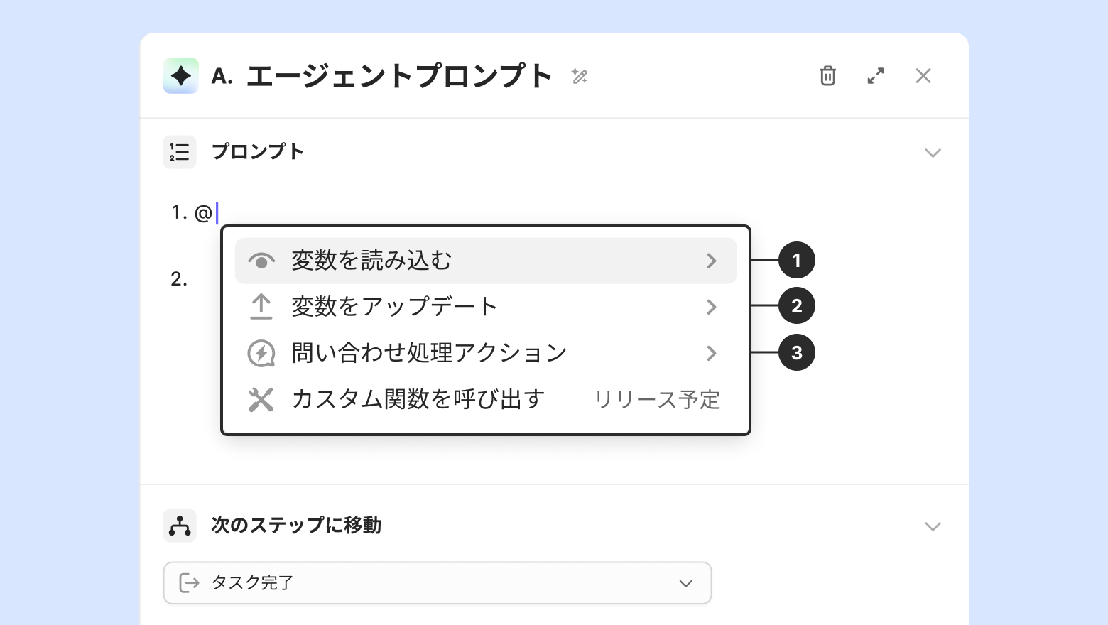 プロンプト作成中に@を入力すると様々な変数を活用でき、問い合わせ処理アクションを使用できます。