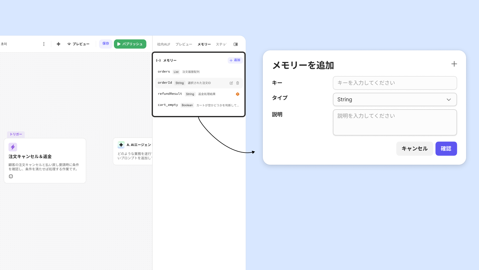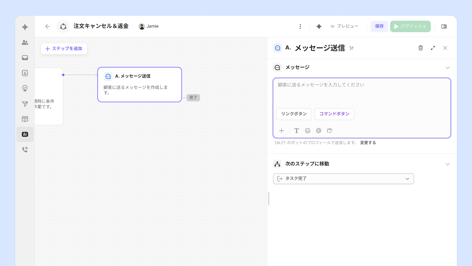 タスクを実行する条件を自然言語で作成します。顧客が「返金してください」「注文のキャンセルを希望します」など、特定の要請をすると自動的にタスクが開始されるように設定できます。