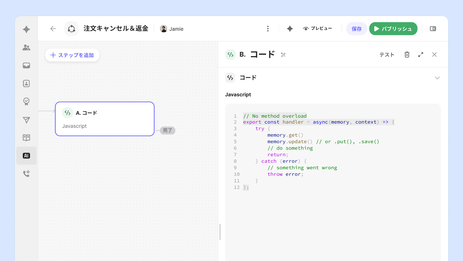 タスクの途中でJavaScript形式のコードを直接実行し、「単純回答」を超えて実際の処理(照会、更新)を行うステップです。