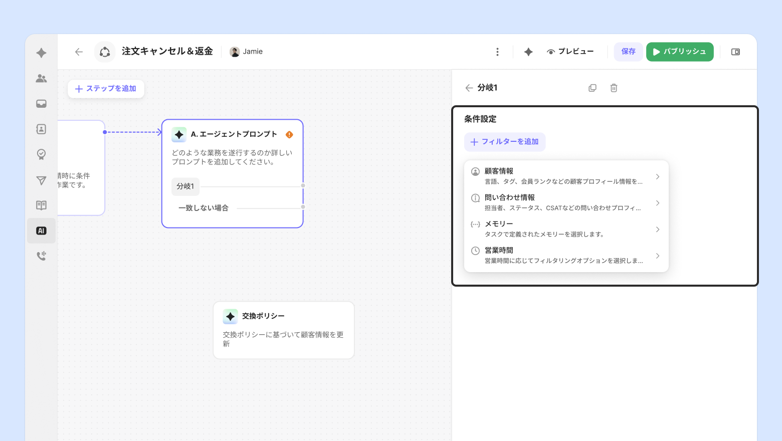 条件で分岐:顧客情報、問い合わせ情報、メモリー、営業時間を基準に、次のステップを異なるように指定できます。