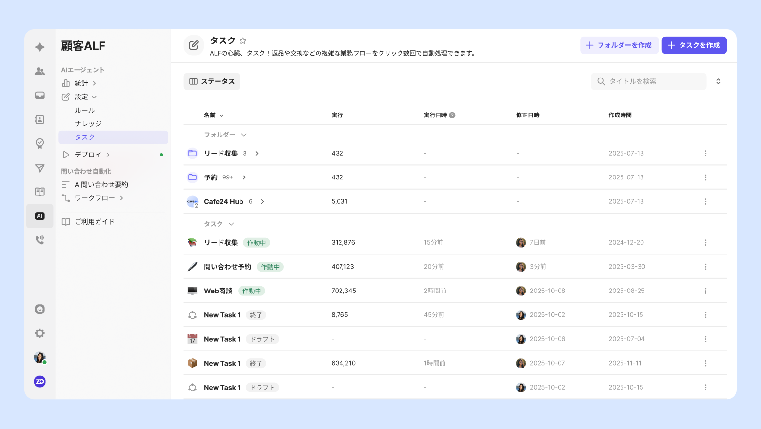 似たようなタスク同士をフォルダーにまとめて管理でき、各タスクの実行状況を確認できます。
