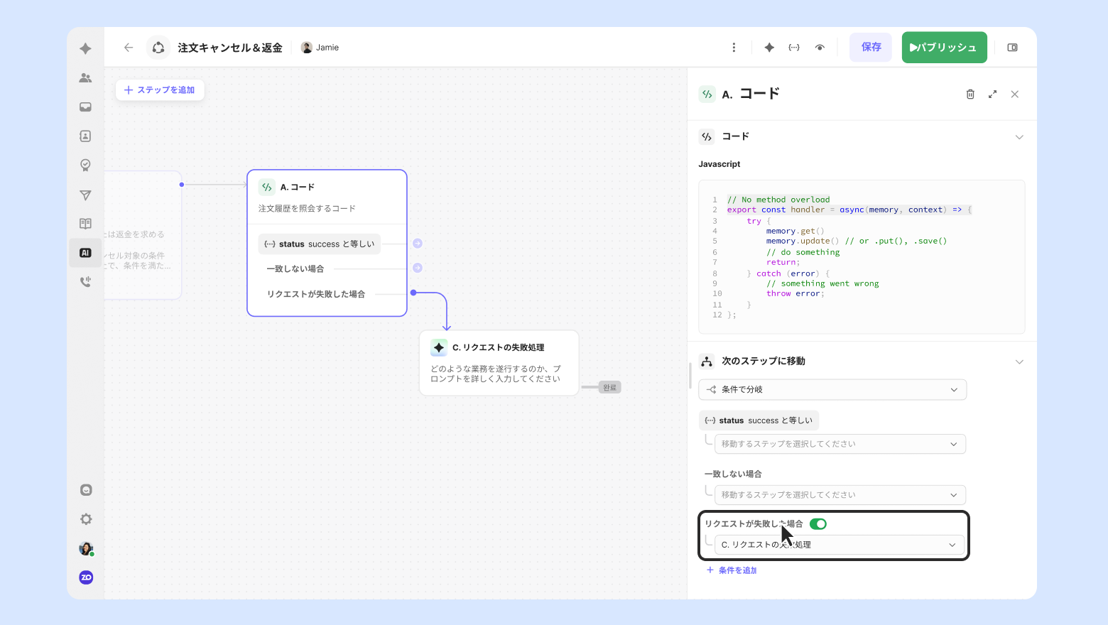 • リクエストが失敗時の分岐:コード・関数・ブラウザー自動化ステップでは、「リクエストが失敗した場合」の分岐を追加で設定できます。失敗時の案内メッセージ送信・他のステップへの接続など、例外的な状況に柔軟に対応できます。