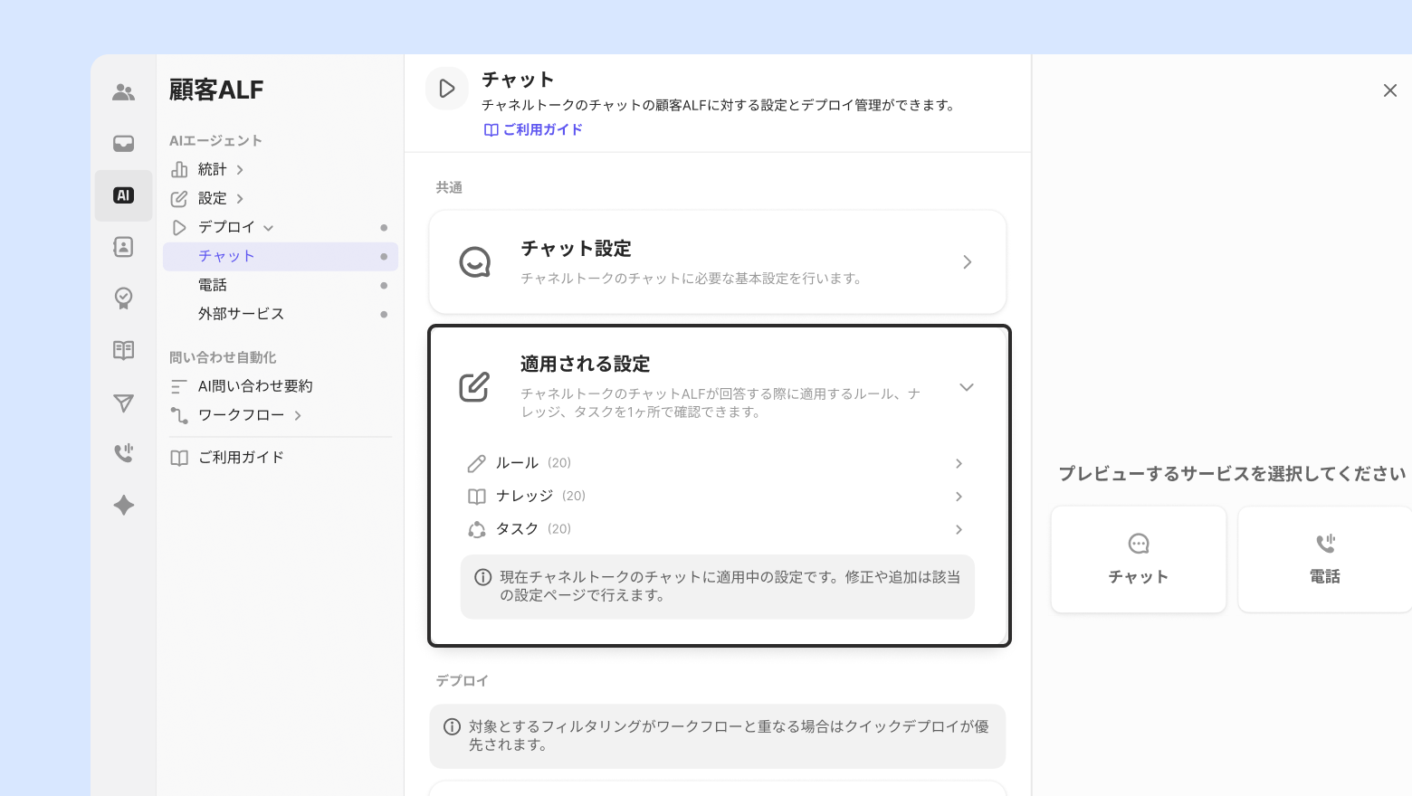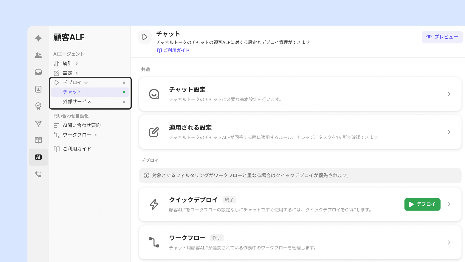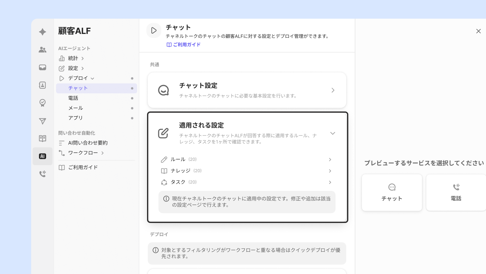 デプロイでは、問い合わせに適用されるALF設定を一ヶ所に集めて点検し、プレビュー画面で実際のALFの応対をテストできます。チャネルトークのチャットだけでなく、各外部サービス別のALF設定も一緒に確認できます。