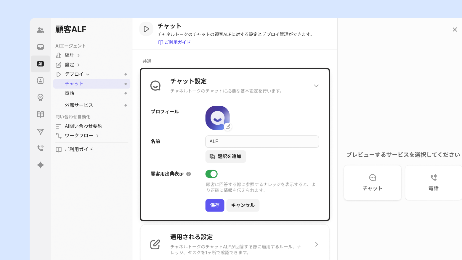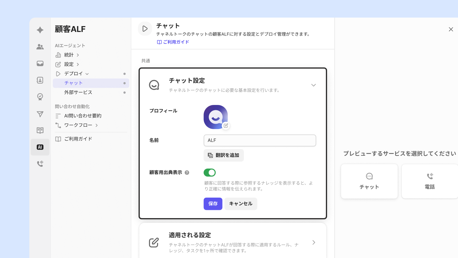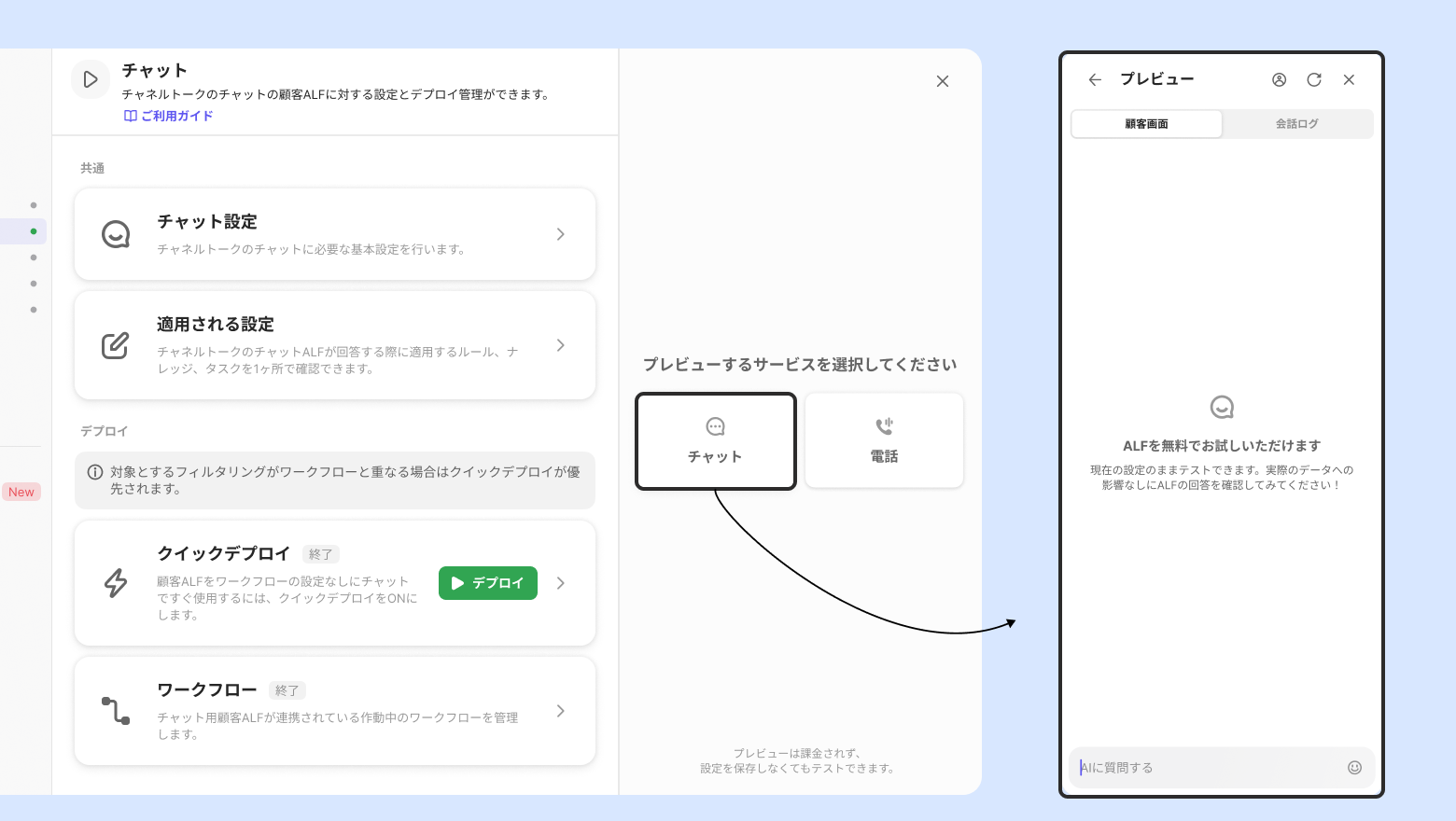 デプロイメニューのプレビュー画面では、現在の設定通りにALF問い合わせを無料でテストできます。チャットと電話のうち、プレビューするサービスを選択後、ALFがちゃんと回答しているかを顧客画面と会話ログで確認できます。