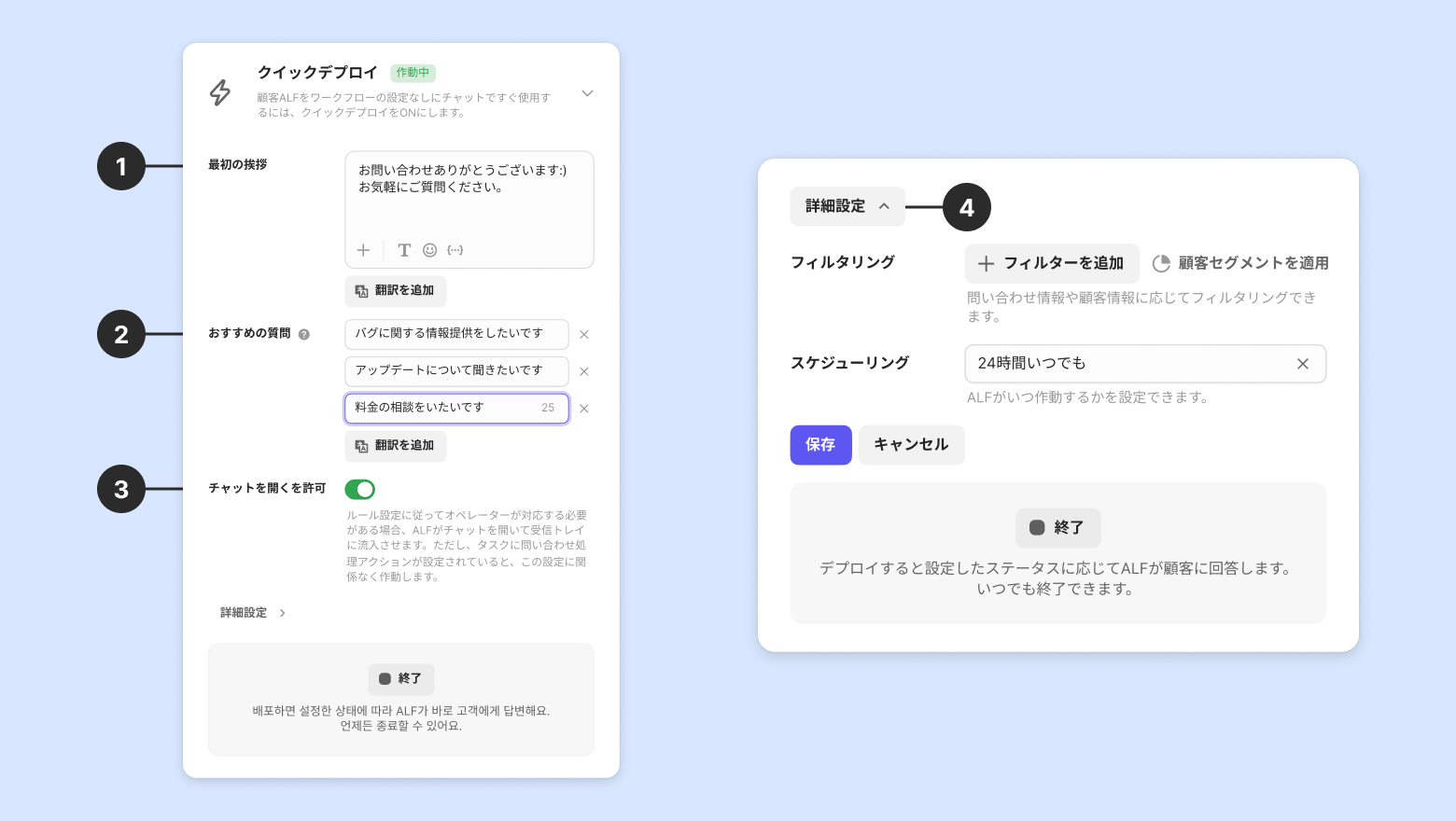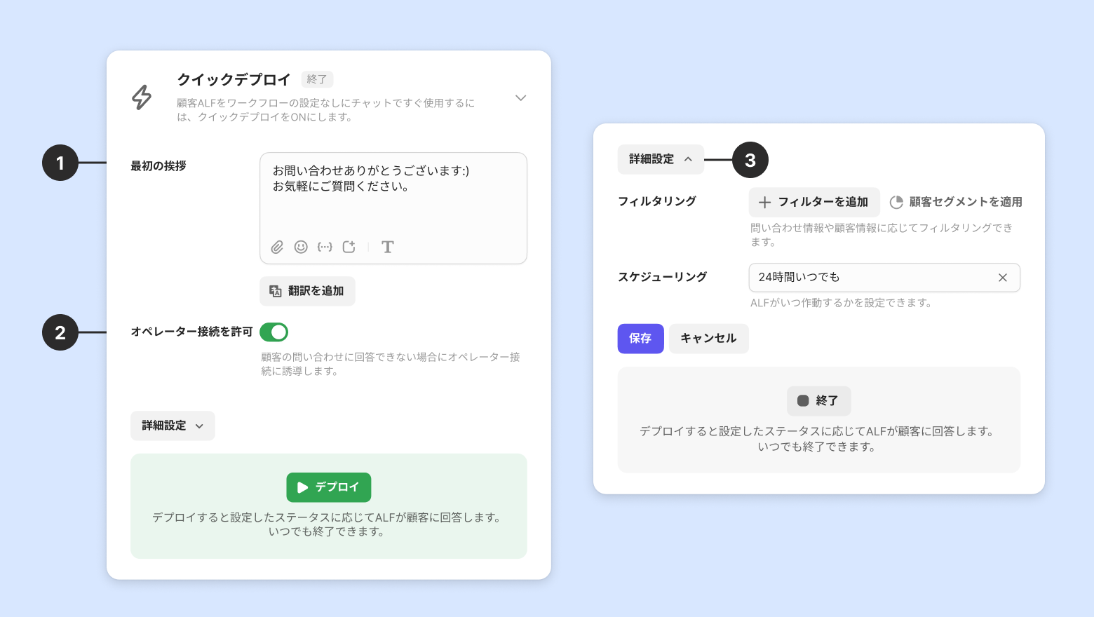 クイックデプロイは、チャット問い合わせで顧客ALFをワークフローなしですぐに使用したい時に設定できる機能です。顧客が問い合わせを開始すると、挨拶メッセージとともにALFと会話できるチャット入力ウィンドウが表示されます。[デプロイ] ボタンを押すと、クイックデプロイがすぐに適用されます。