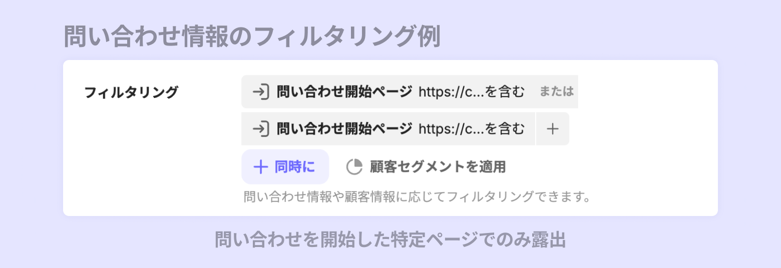 [フィルタリング] - [問い合わせ情報]:問い合わせ開始ページの情報条件を追加し、特定ページでのみクイックデプロイ機能を露出できます。顧客のアクセスページに応じてクイックデプロイの露出有無を設定してください。
