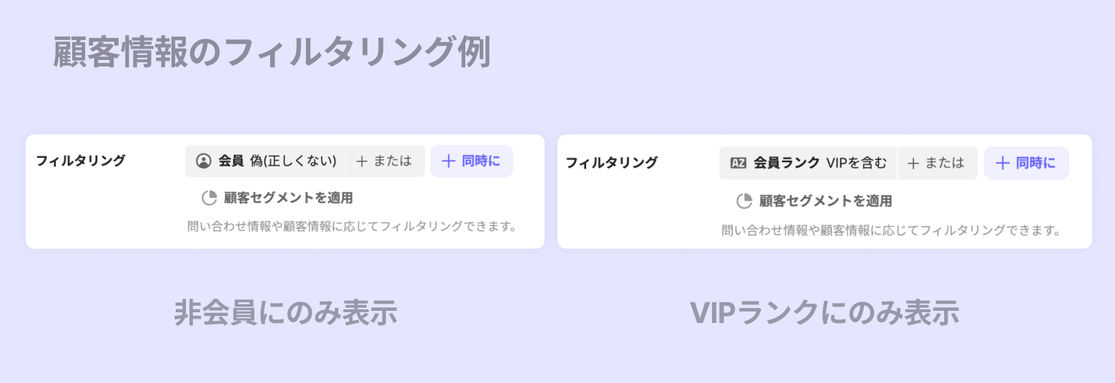 [フィルタリング] - [顧客情報]:特定の顧客条件に応じて、クイックデプロイを適用するかを設定できます。顧客セグメントに応じてカスタマイズされたALF体験を提供できます。