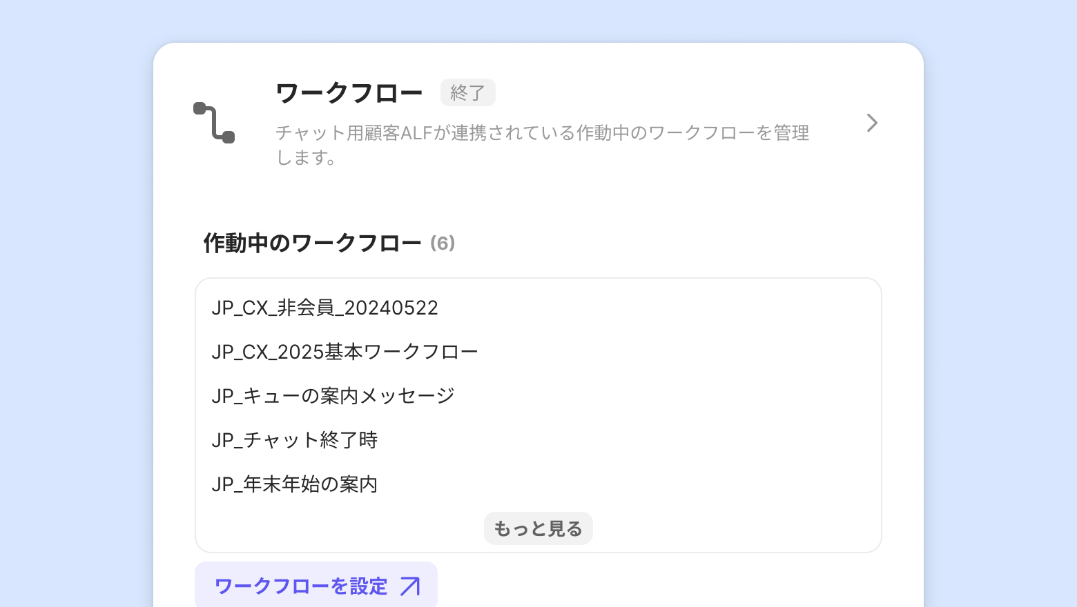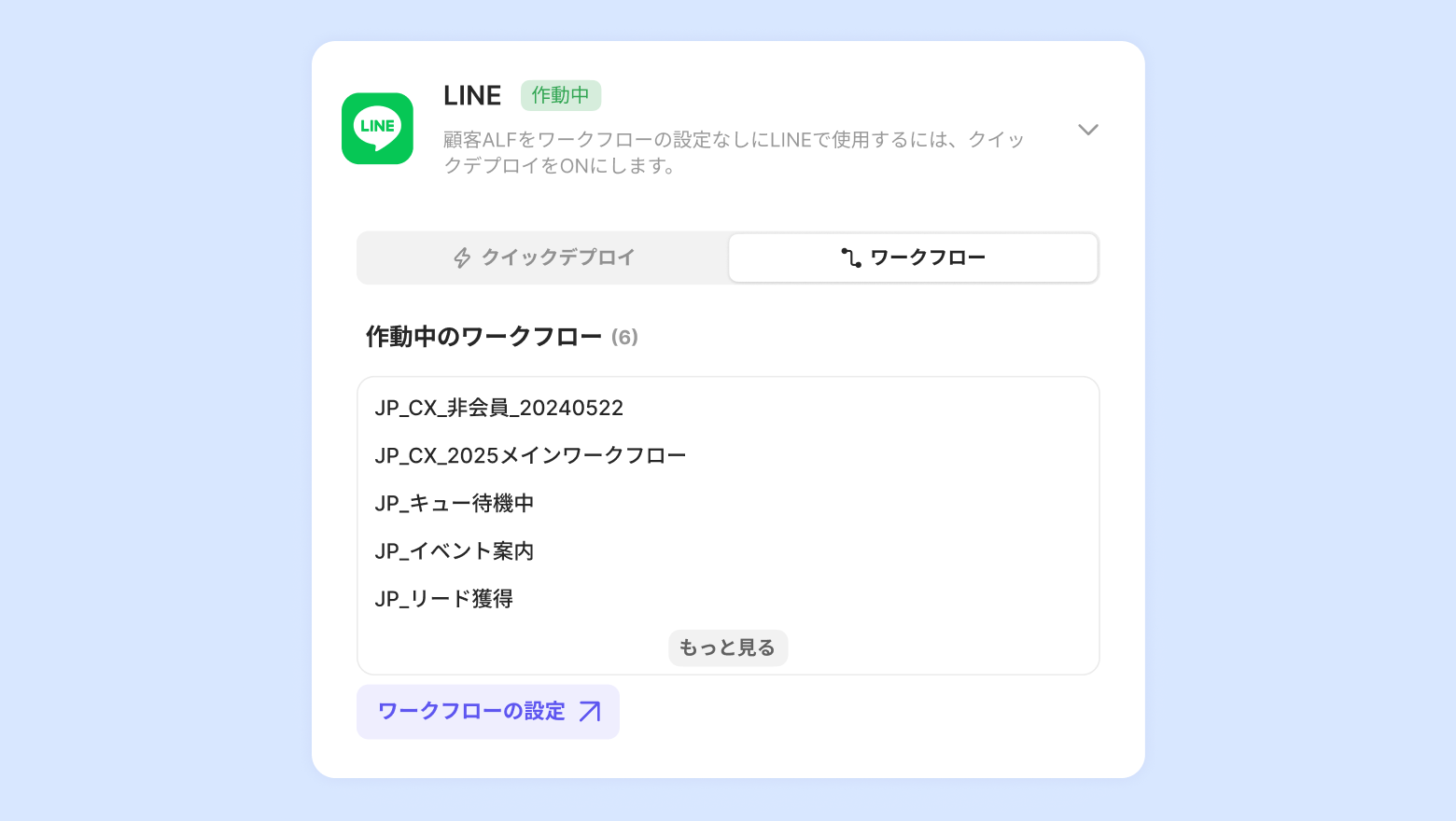 外部サービス別に顧客ALFが接続されている作動中のワークフローを管理できます。どのワークフローに [顧客ALF対応] アクションが設定されているかを確認し、クリックすると各ワークフローの設定画面に移動できます。