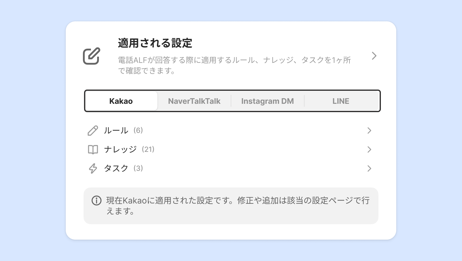 外部サービス別に顧客ALFが回答する際に適用されるルール・ナレッジ・タスクを一ヶ所で集めて点検できます。現在適用中の設定を確認することができ、クリックすると該当の設定ページに移動して追加で修正もできます。