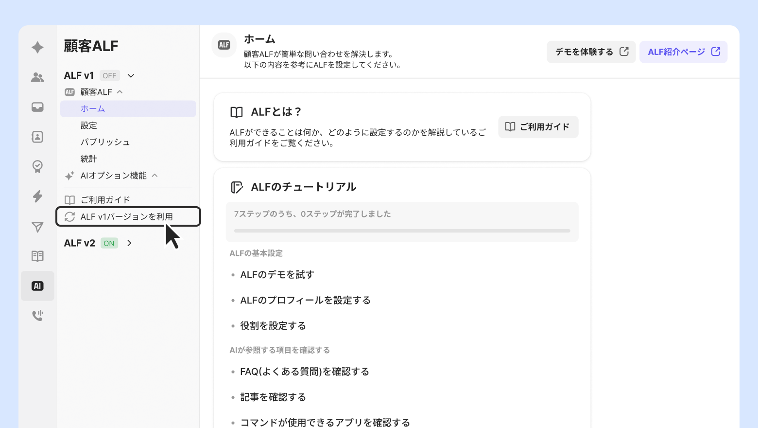 [AIメニュー] - [ALF v2] - [ALF v1バージョンを利用] ボタンをクリックします。