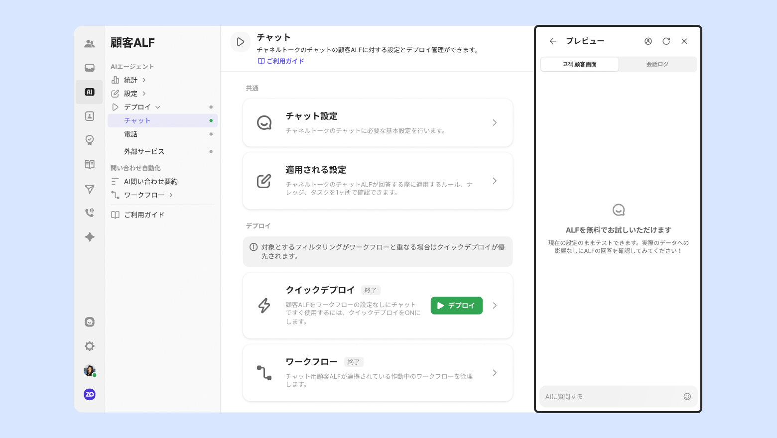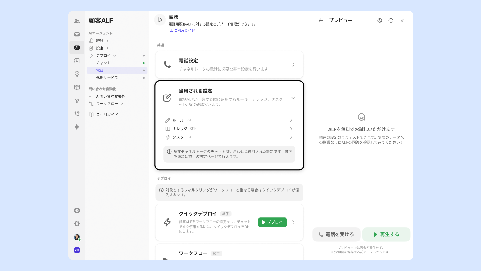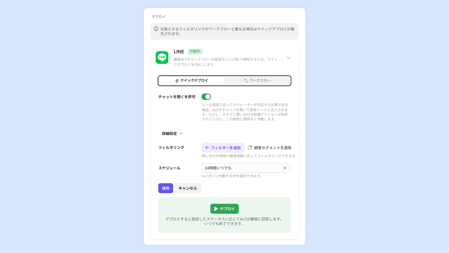 ワークフローの設定なしに顧客ALFがすぐに応対する機能です。[デプロイ] ボタンを押すとクリックデプロイを適用できます。