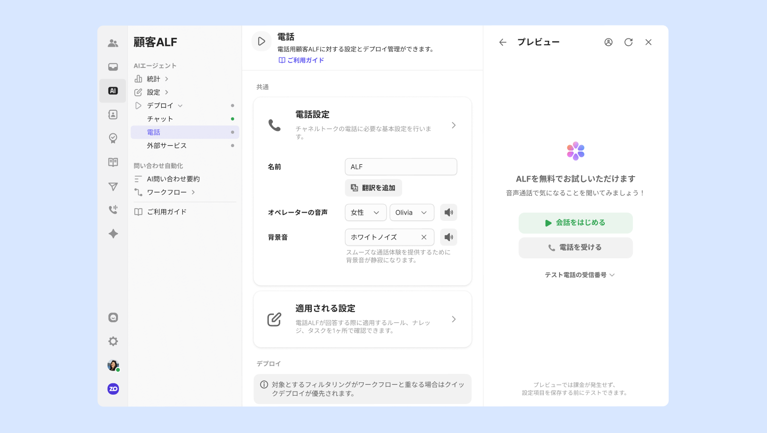 IVRワークフロー設定がなくても、顧客が電話をするとすぐにボイスALFが応対するように設定できます。顧客がALFに接続すると、最初の挨拶で設定した音声メッセージとともにALFとの通話が開始します。[クイックデプロイ] ボタンをクリックすると、クイックデプロイが適用できます。