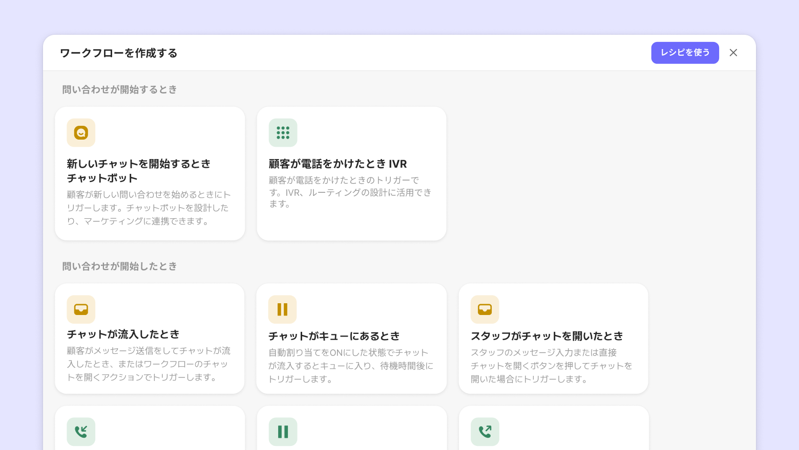 [電話] 電話がキューにあるとき | 自動割り当てをオンにした状態で電話が流入すると、割り当てられるまでキューに入ります。待機時間中にキューにある場合にトリガーします。 |