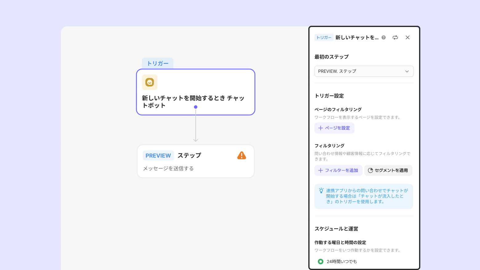 問い合わせが開始したとき | チャットが流入したとき | 顧客によってチャットが流入したときにトリガーします。
