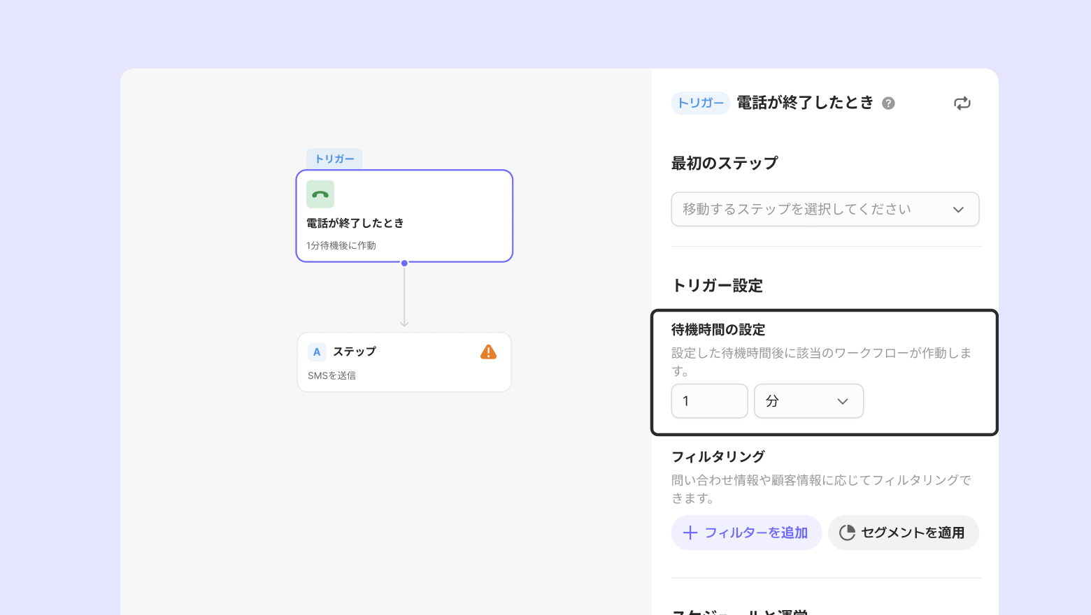 [トリガー設定] - [待機時間] で電話が終了した時間から一定時間が経過してからワークフローを作動させることができます。待機時間のデフォルトは1分で、最短0秒から最大72時間まで設定できます。