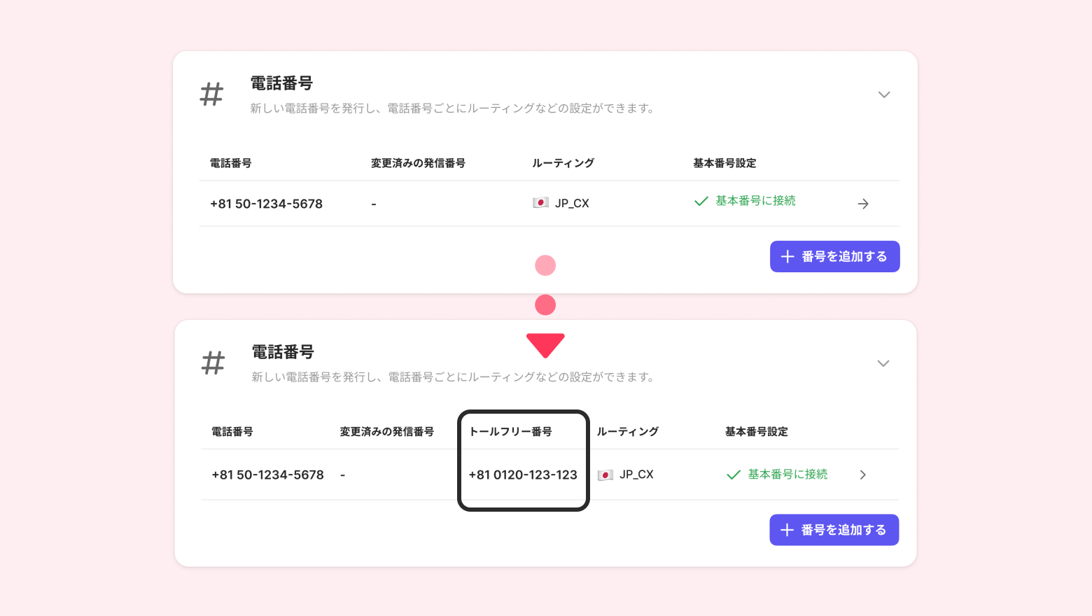 トールフリー番号は必ず裏側で050番号と紐づける必要があります。
