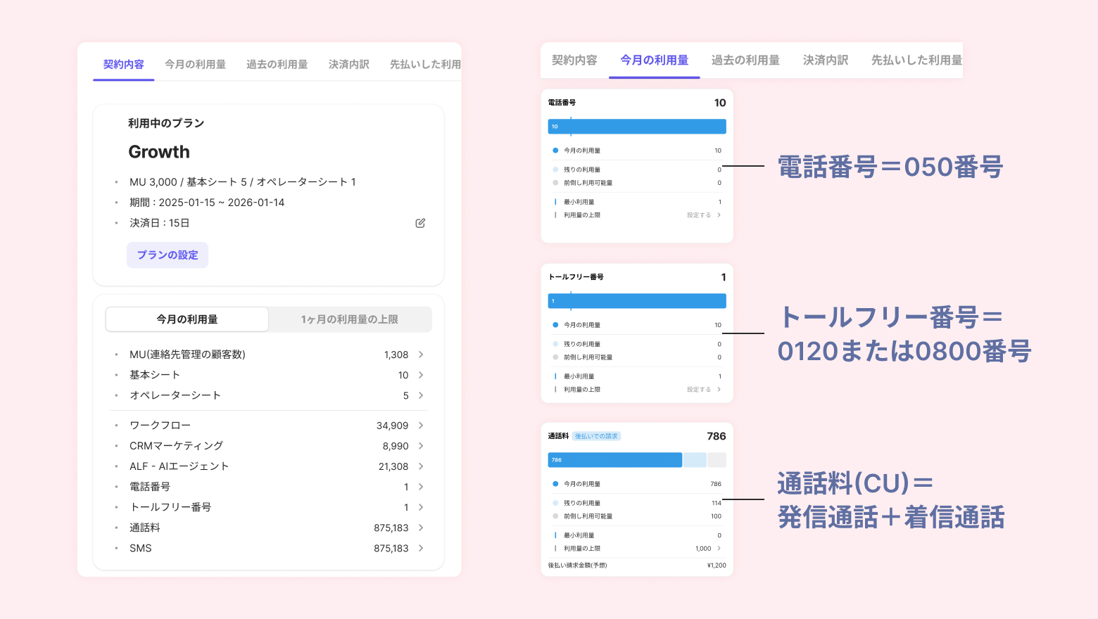 トールフリー番号を利用中の場合、[通話料] は発信/着信を合算したCUが表示されます。(発信/着信は今度分けて表示できるようにご提供予定です)