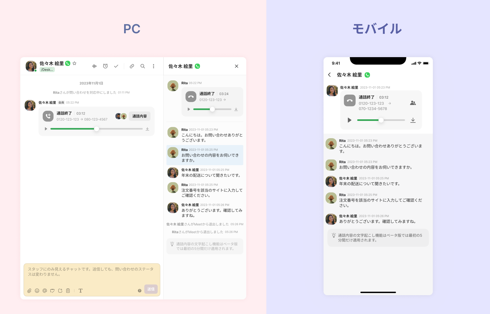 発信/着信があった該当の接客チャットの"通話終了"の下に、発信/着信した電話番号が表示されます。(→電話の利用方法を確認する)