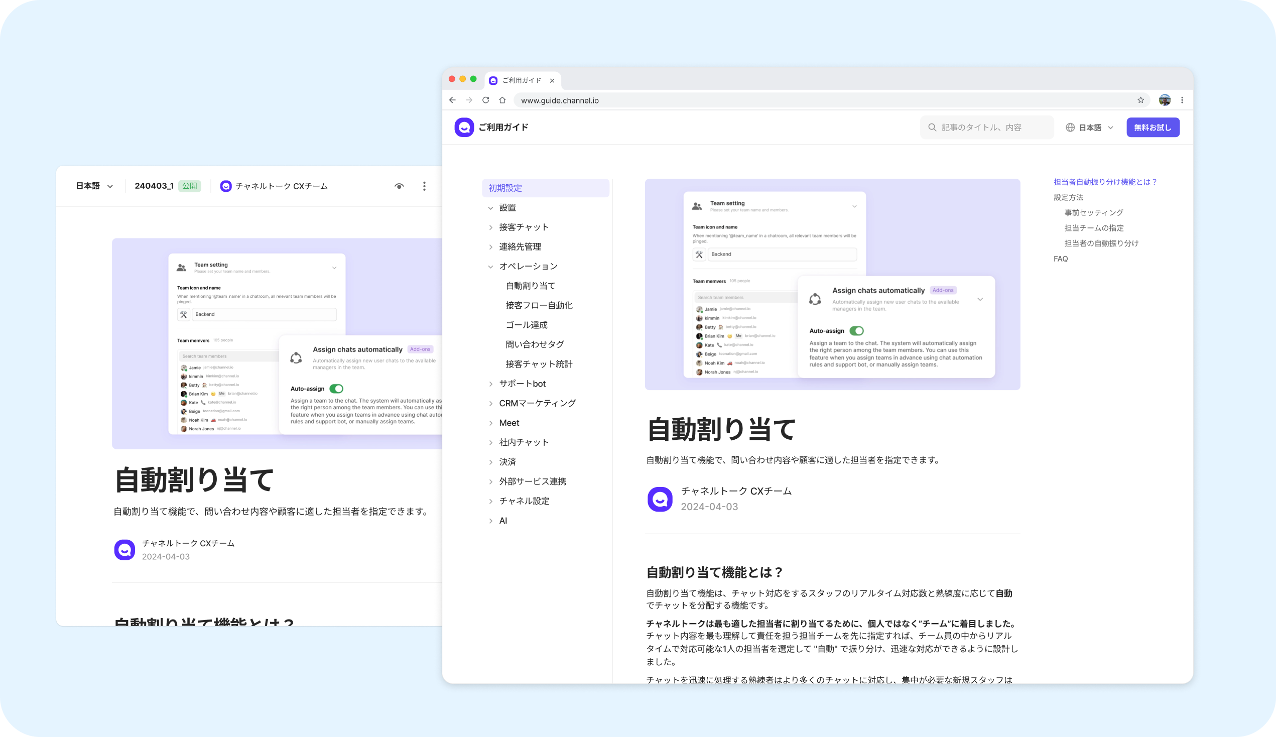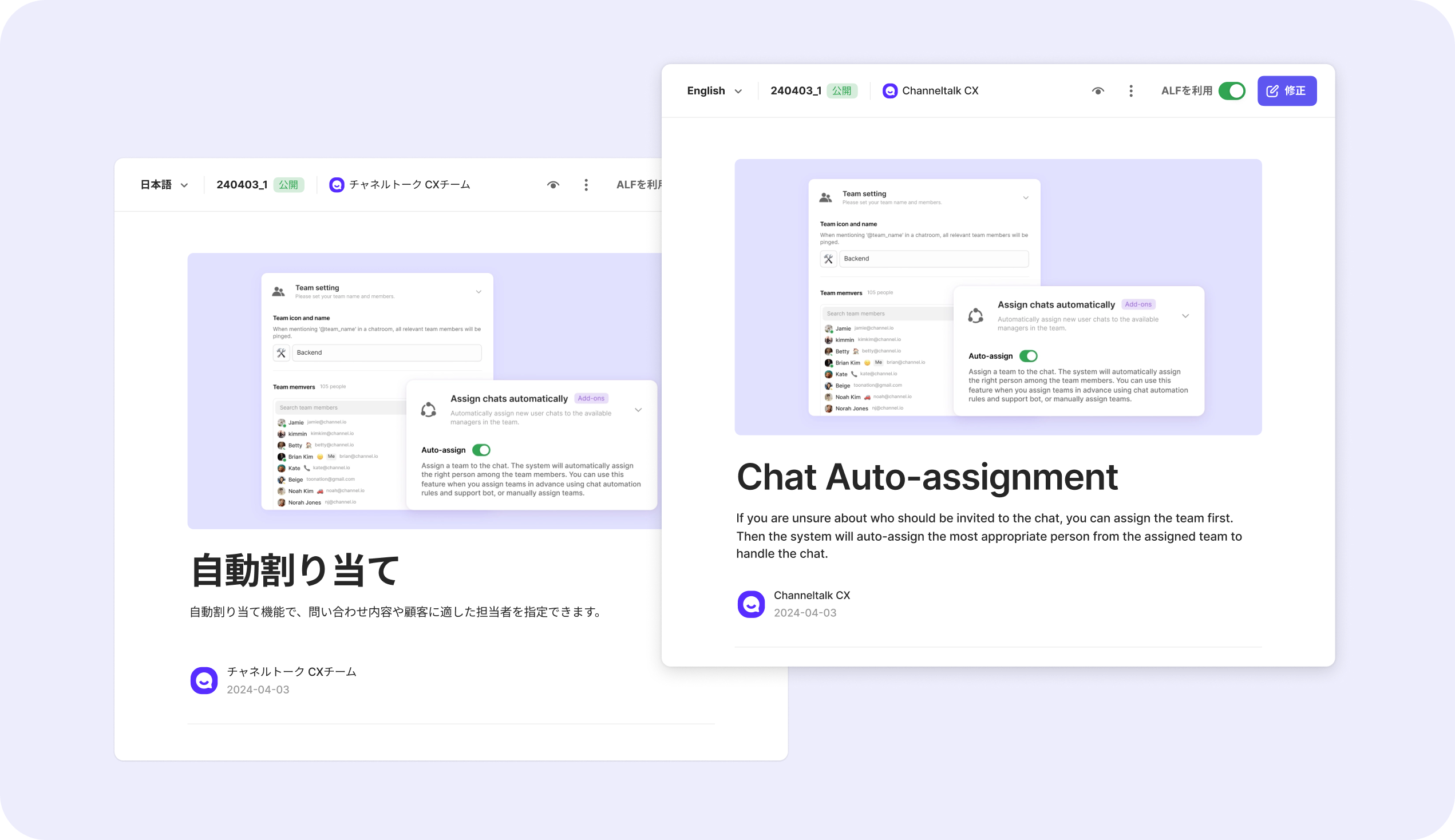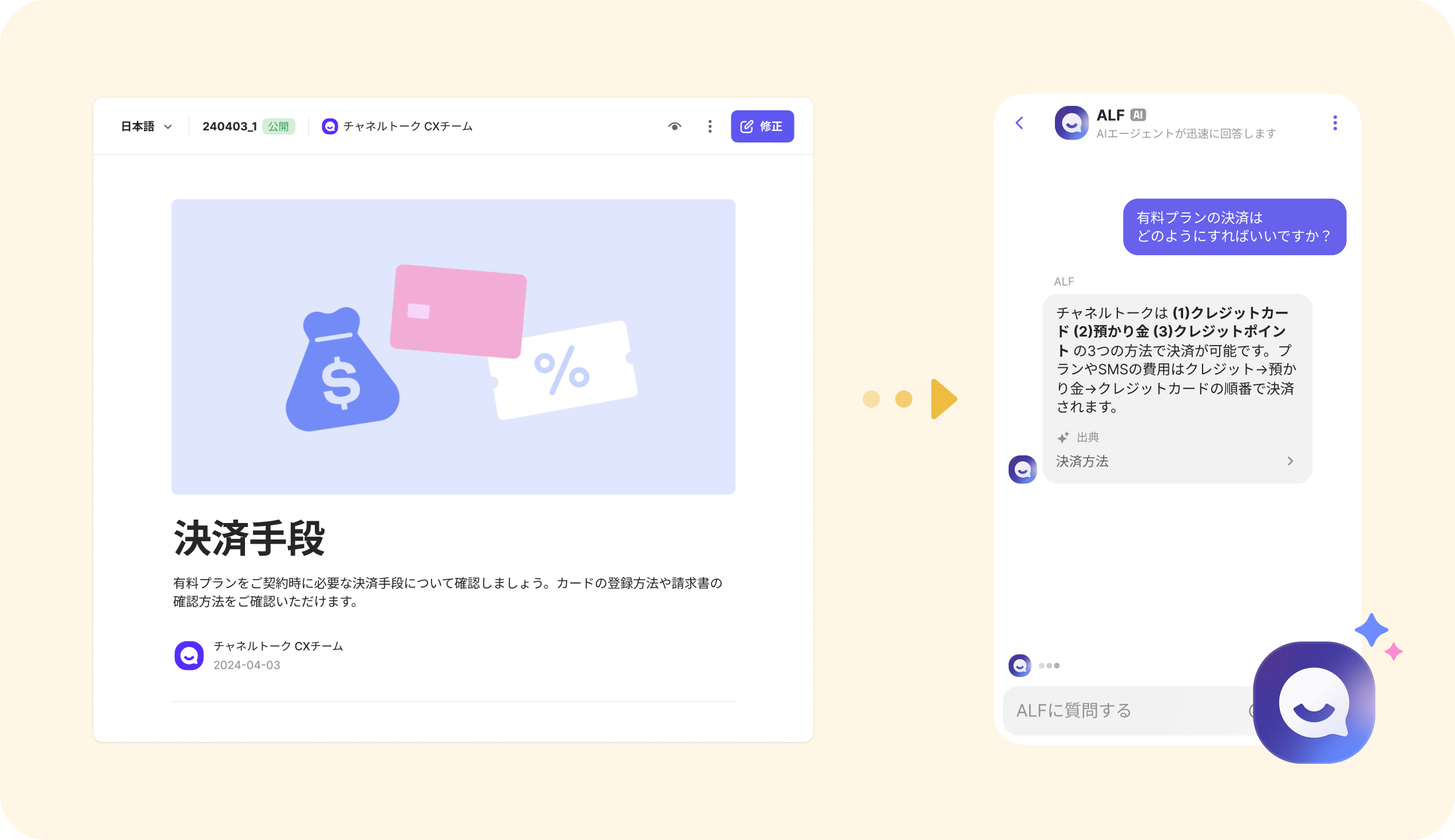 チャネルトーク内でご利用ガイドやブログ、アップデート情報などのコンテンツを管理し、ウェブサイトに公開できるようにサポートする機能です。AIエージェントALFがドキュメントに登録された内容を参考し、顧客対応に活用します。