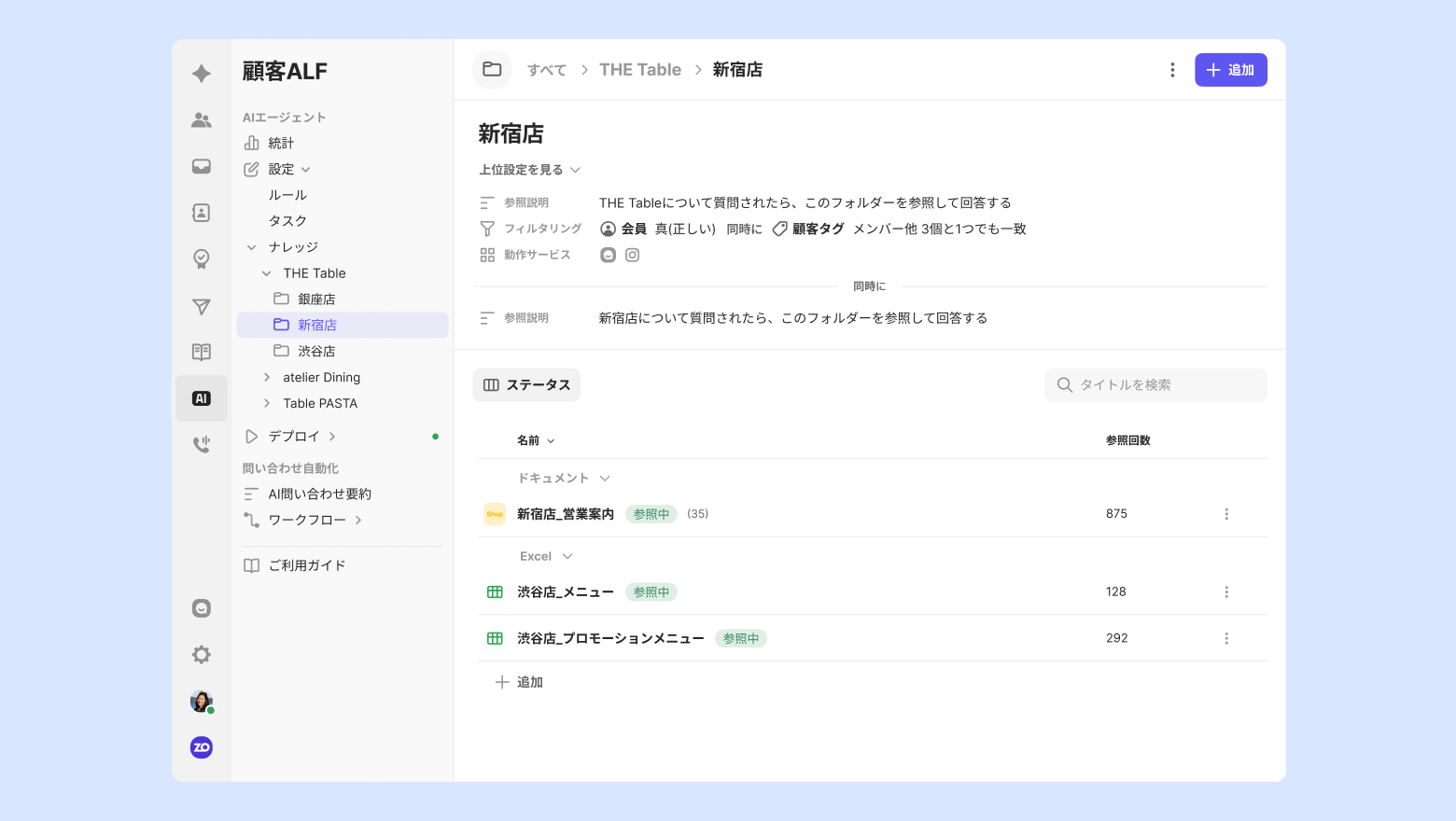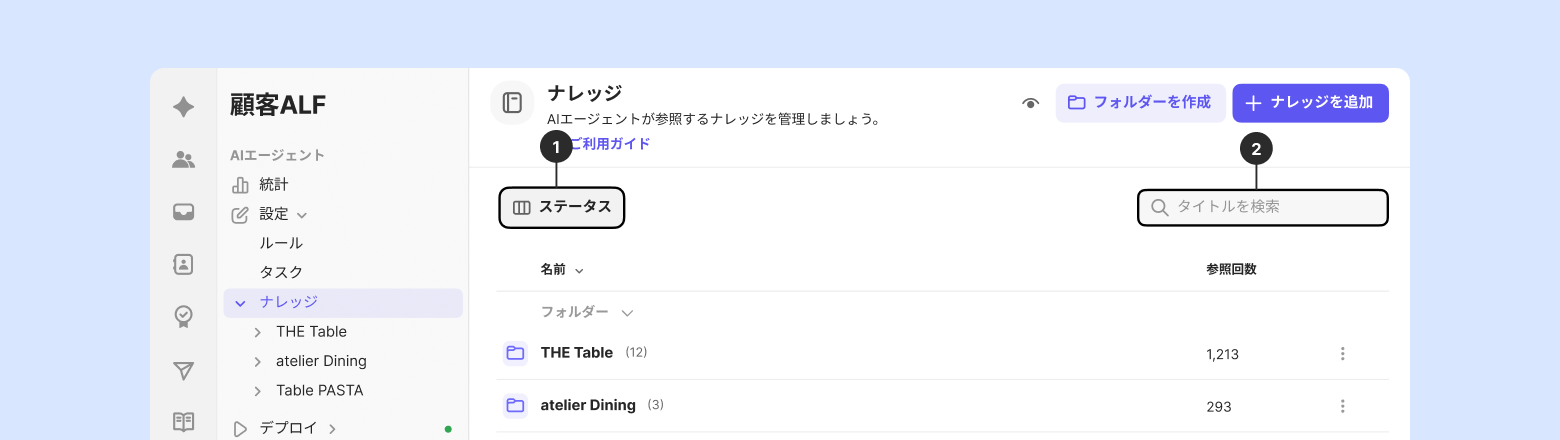 各フォルダーでは、参照説明を作成したり、フィルタリング条件を設定して、状況ごとに異なるナレッジを参照するように制御できます。