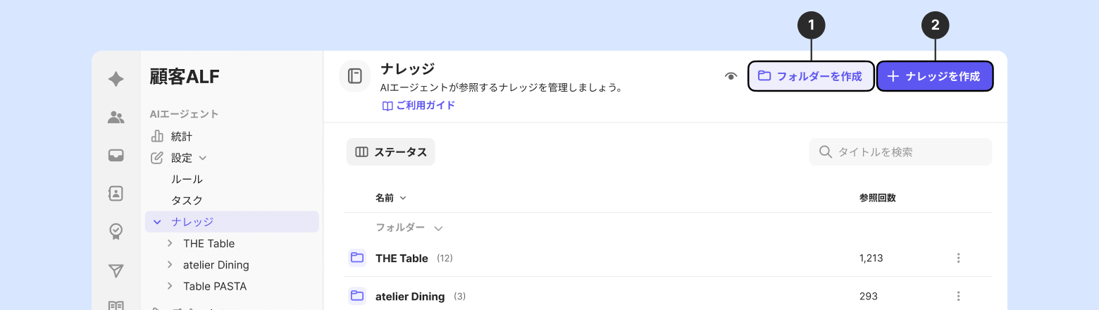 ❷ [AI] - [設定] - [ナレッジ] の右上にある [+ナレッジを作成] - [フォルダー] を選択