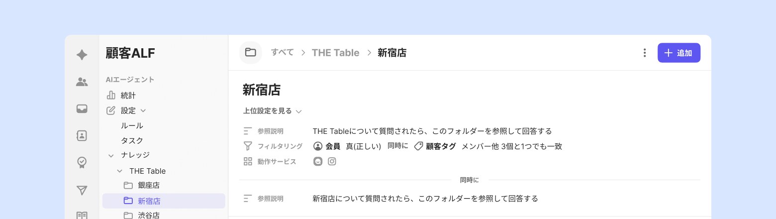 フォルダーはナレッジタブで作成でき、各フォルダー別にALFが参照するフィルタリング条件と動作するサービスなどを詳細に設定できます。