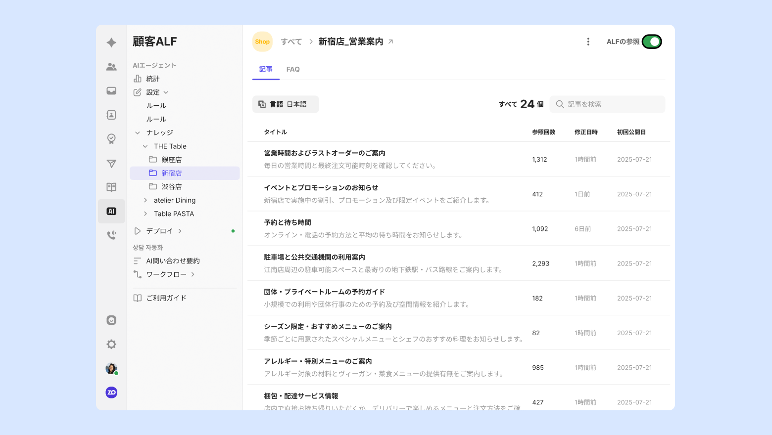 ALFの参照状態(ON/OFF)に応じてナレッジをフィルタリングできます。他のページを見てから戻ってきても、フィルタリングは継続します。