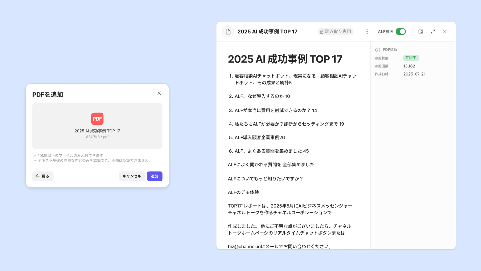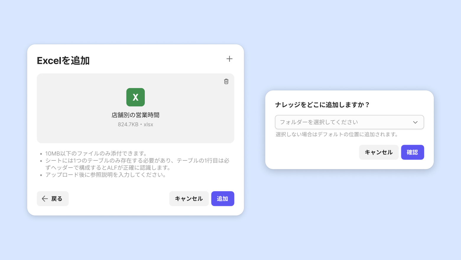 フォルダー内にあるALFが参考にする資料を意味し、記事や Excelなどの様々な形式で登録できます。