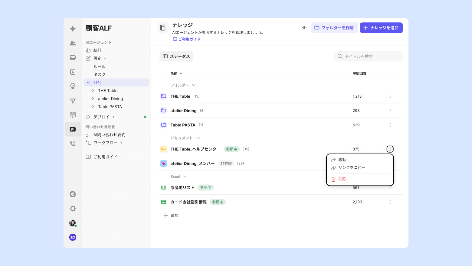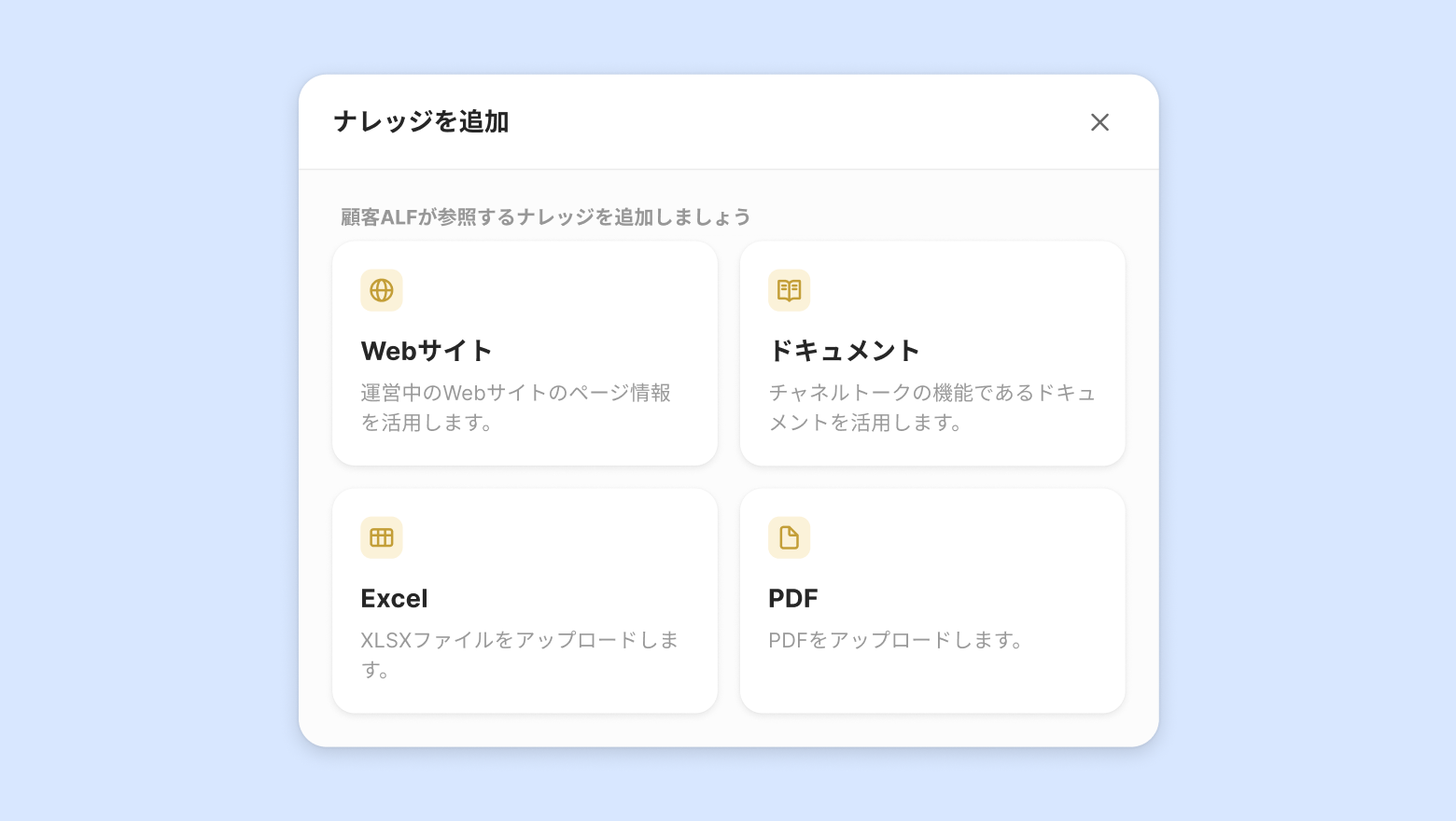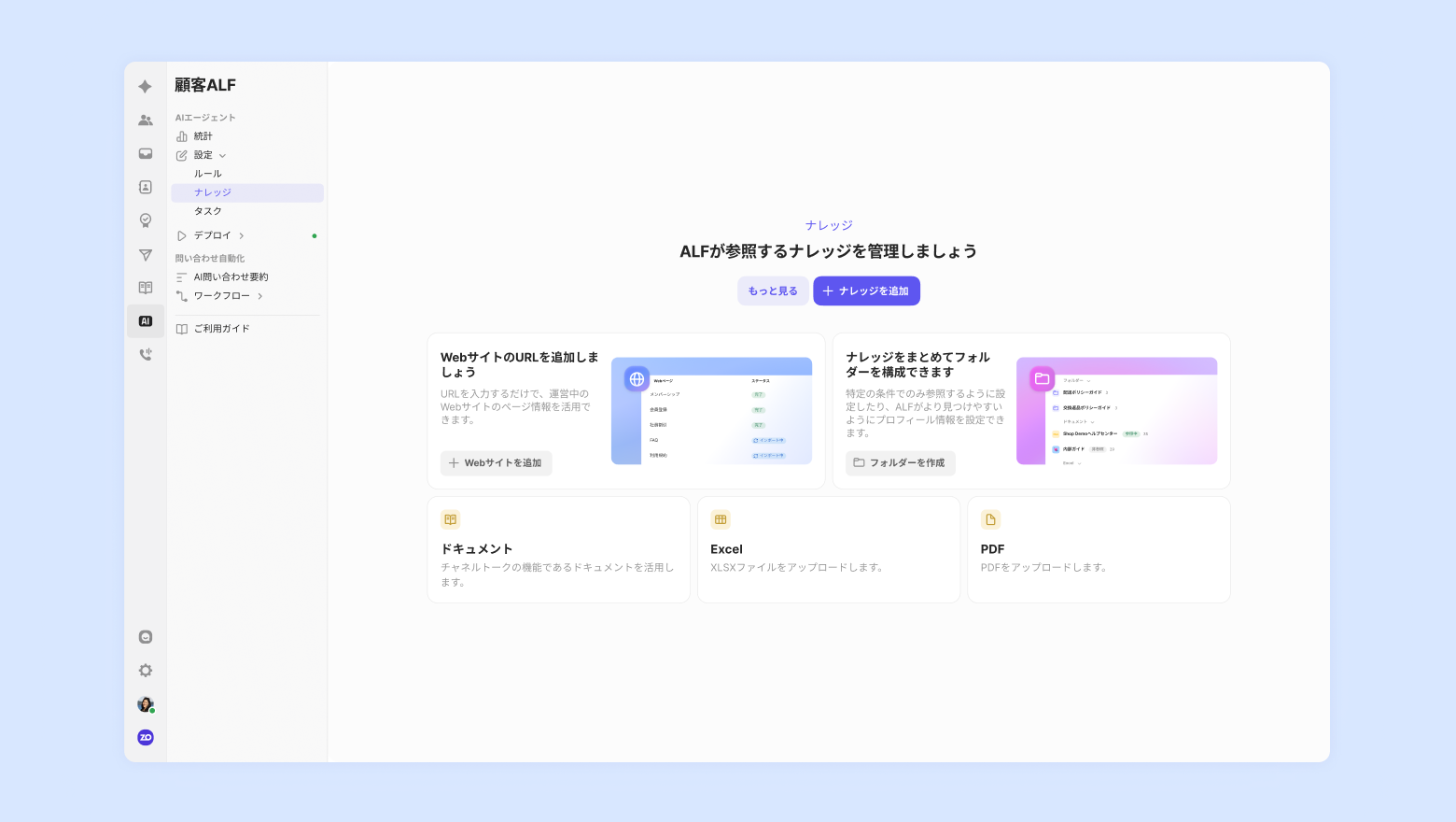 ナレッジはALFが参照できるように文書やファイル、Webサイトなどの多様な資料を集めて管理する空間です。