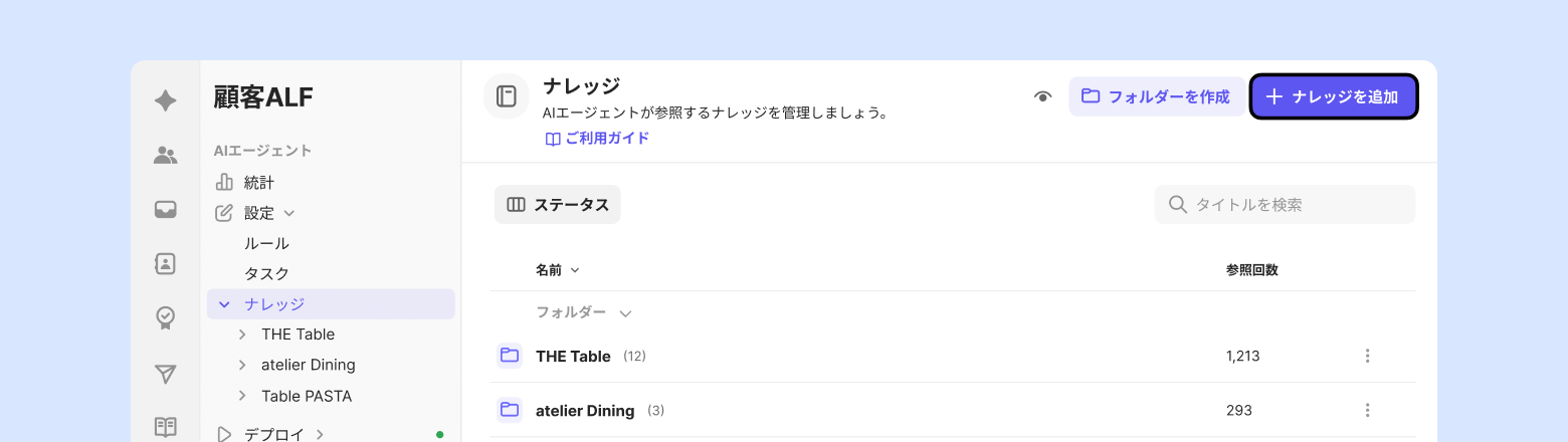 [AI] - [設定] - [ナレッジ] の右上にある [+ナレッジの追加] ボタンを押して、新しいナレッジを登録できます。