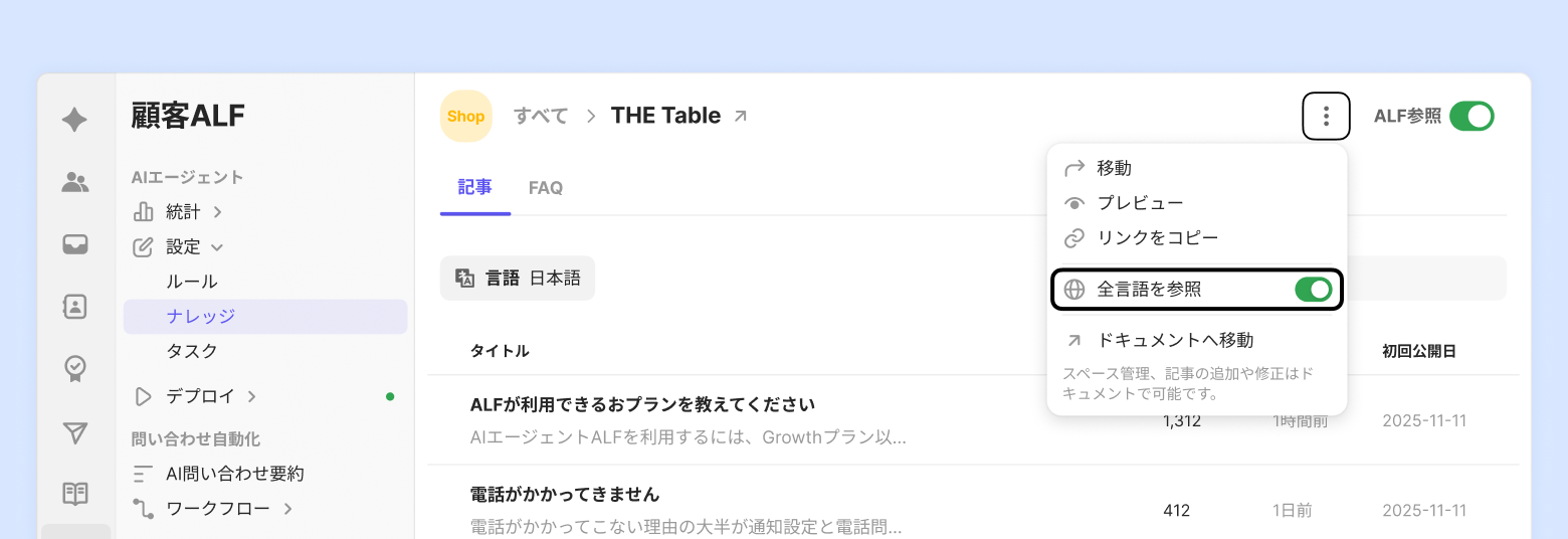 全言語を参照設定ON:ドキュメントに翻訳版がなくても、ALFが顧客の問い合わせ言語を自動的に認識して回答します。