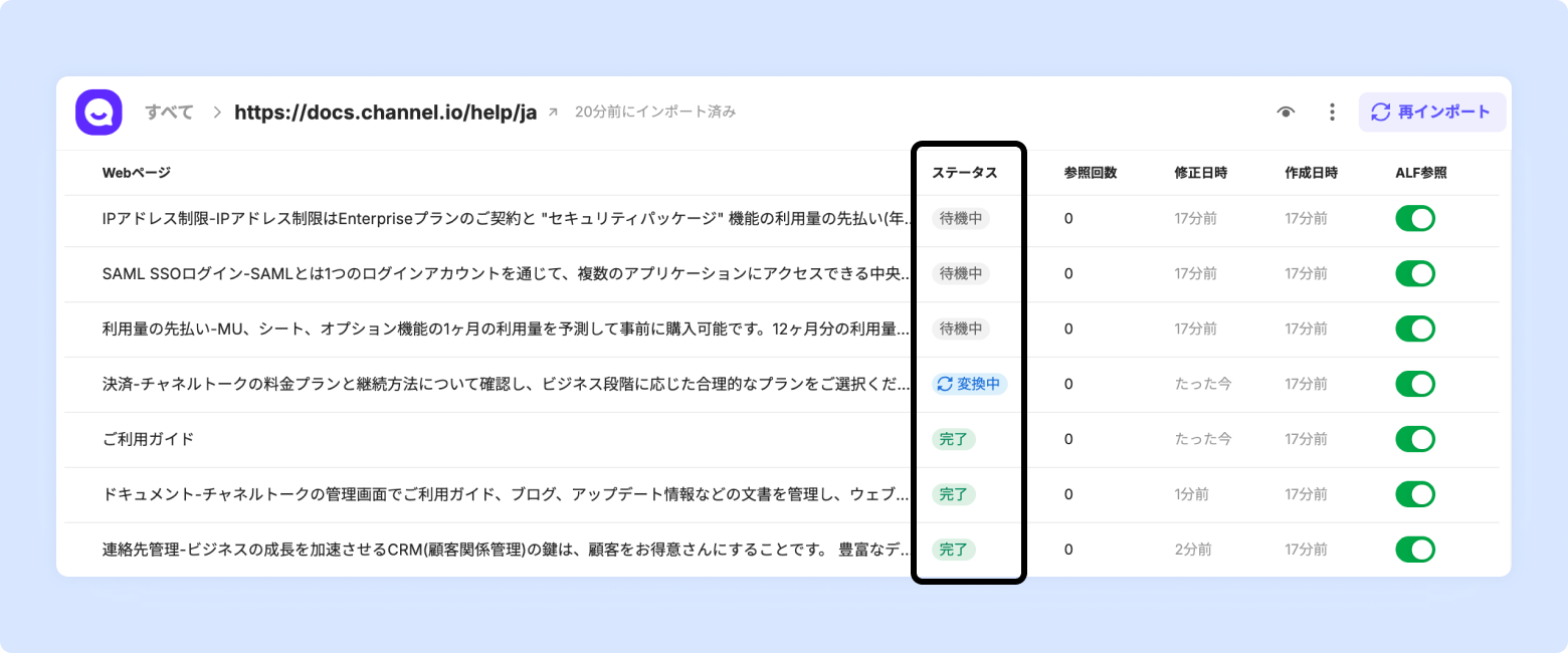 「完了」ステータスのWebサイトをクリックすると、参照中のWebページを確認することができます。もし不要なWebページがある場合は [ALFの参照] をOFFにします。