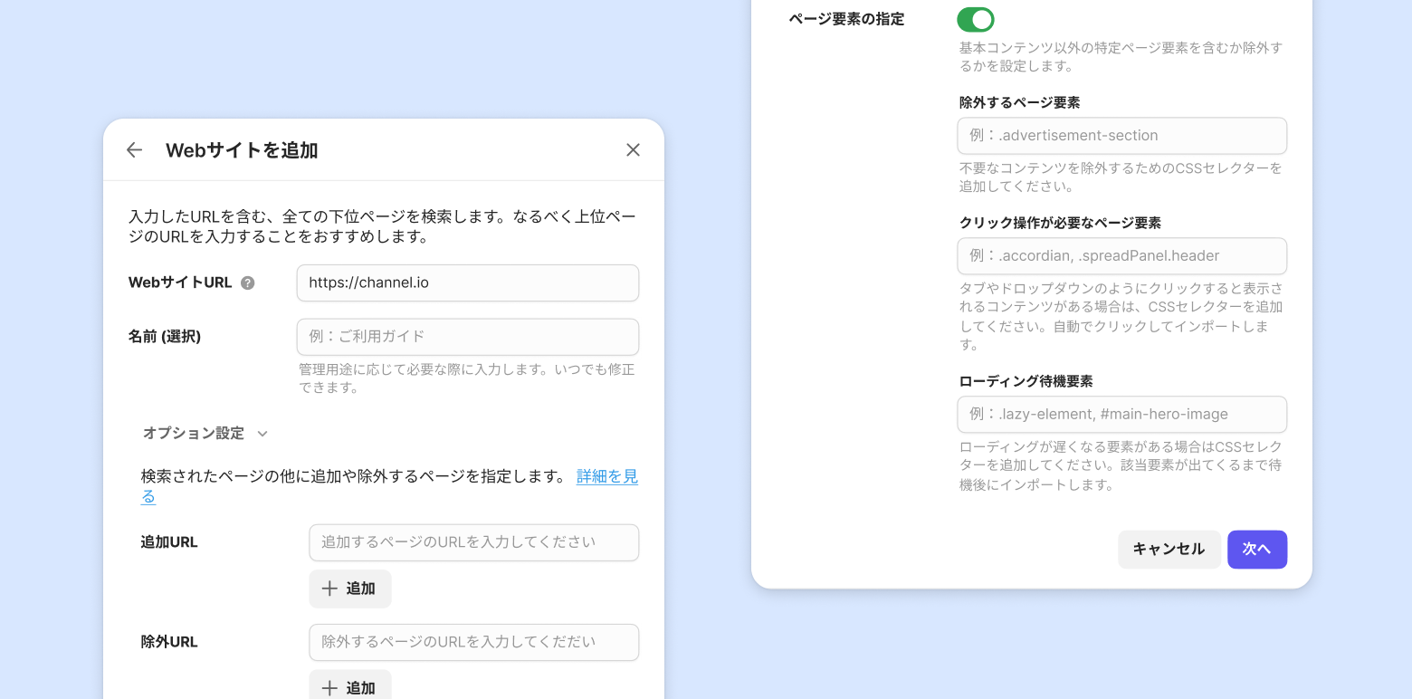 ページ要素の指定: Webページ内においても、ALFが参照する情報と除外する情報をより細かく設定することができます。ページ要素の指定は、Webページの構造(CSS)に対する理解が必要なオプション設定であり、特定の要素が誤って収集されたり、漏れた場合にのみ使用することをおすすめします(→ 詳しくみる)。