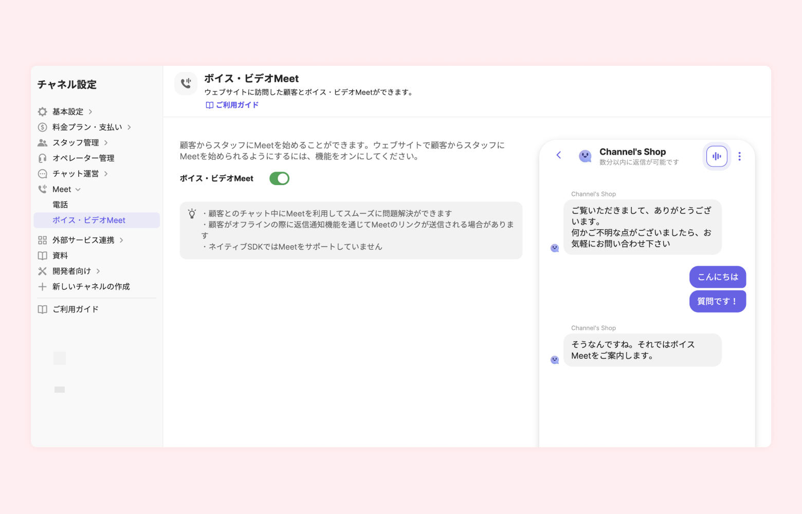 顧客からチームメンバーにボイスMeetを始められるように設定できます。設定をすると顧客のチャット画面でMeetを始めるためのボタンが表示されます。