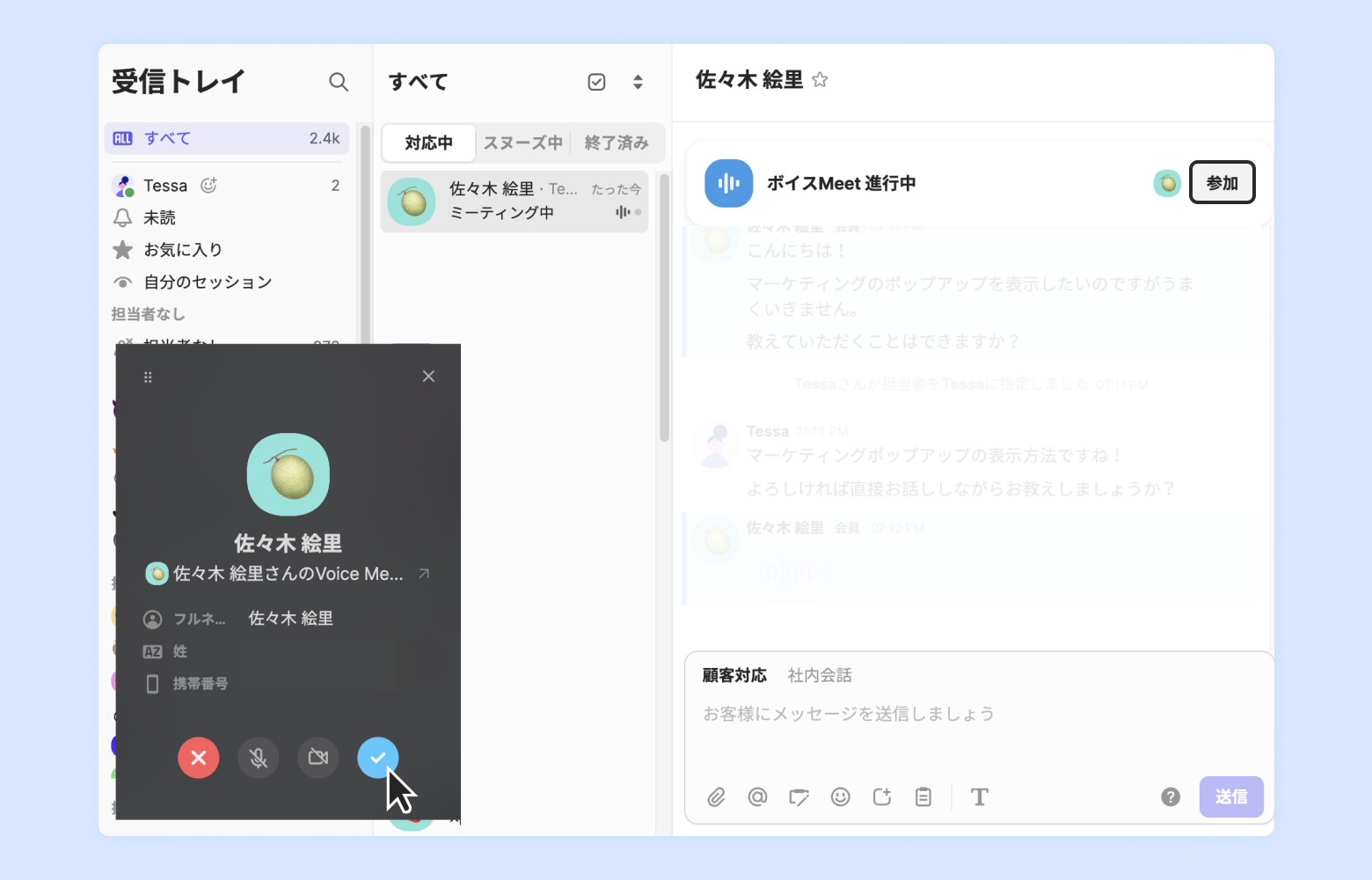 顧客のチャット画面で担当者がついているチャットの場合のみにMeetボタンが表示され、顧客がMeetをかけるとそのチャットの担当者に着信が届きます。