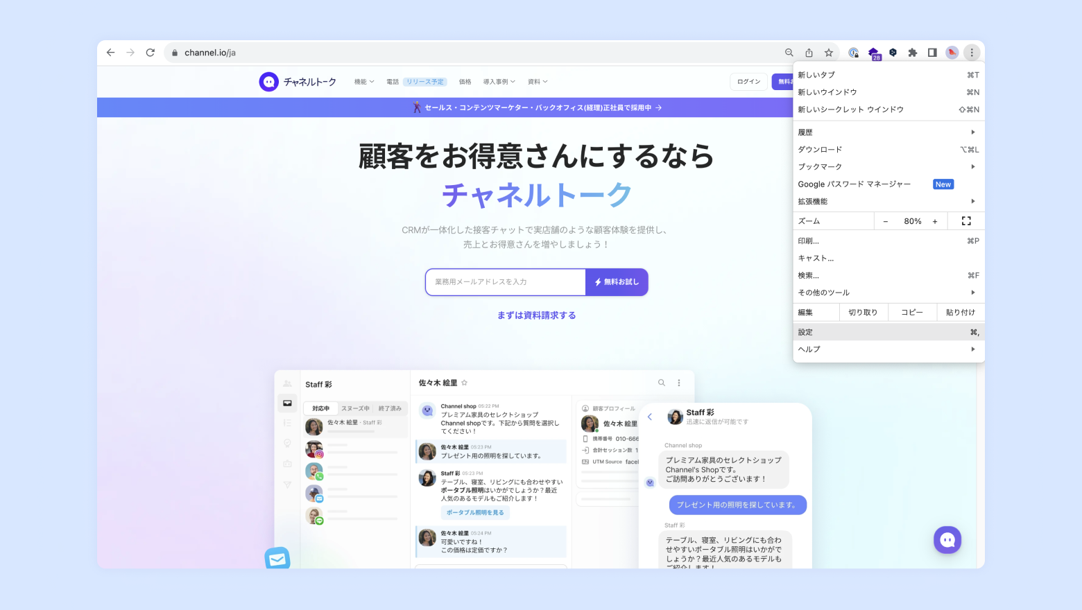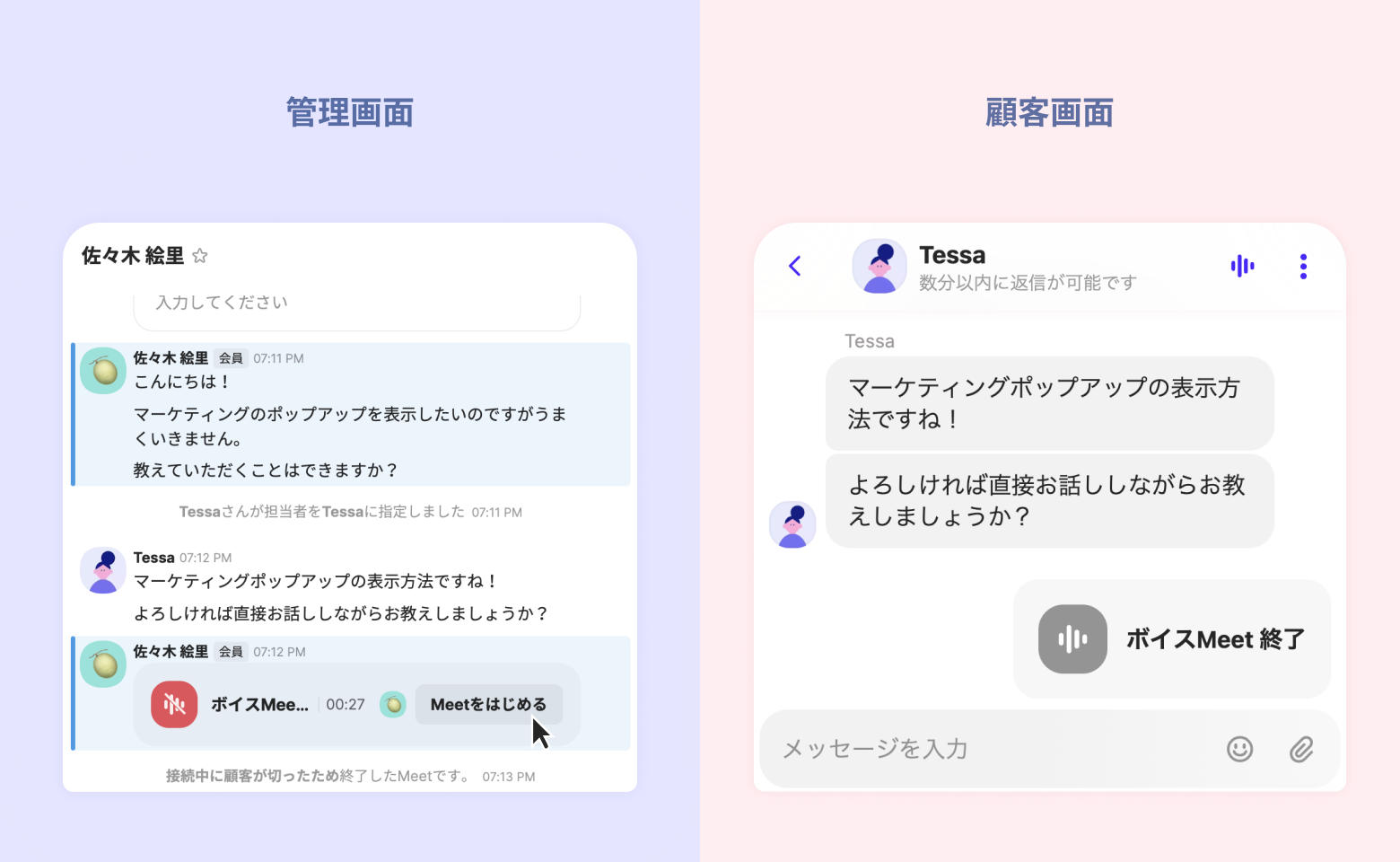 担当者のついている接客チャットでボイスMeetとビデオMeetでき、引き続き同じチャットでやり取りを続けられます。