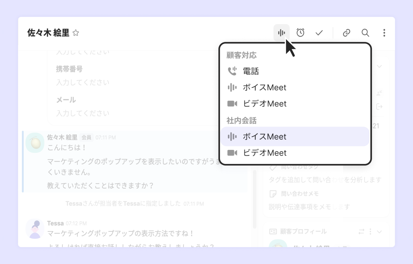 チャットに参加しているチームメンバー間で迅速にコミュニケーションが必要な場合は、社内会話でMeetを活用してください。ボイスまたはビデオMeetを利用して状況を共有できます。