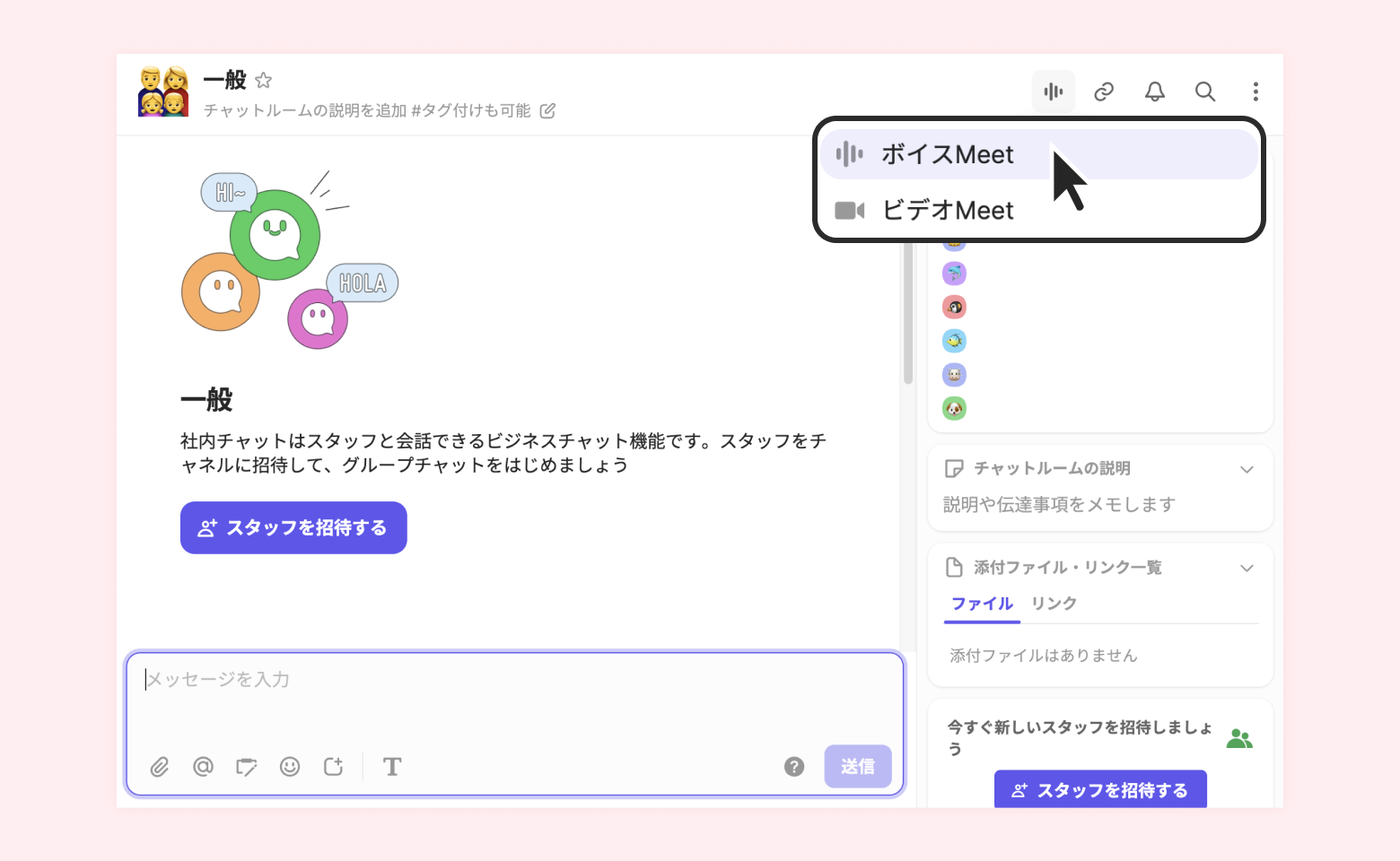 社内会話の下部にある [ボイスMeet] をクリックするとチャットに参加しているチームメンバーにMeetをかけることができます。