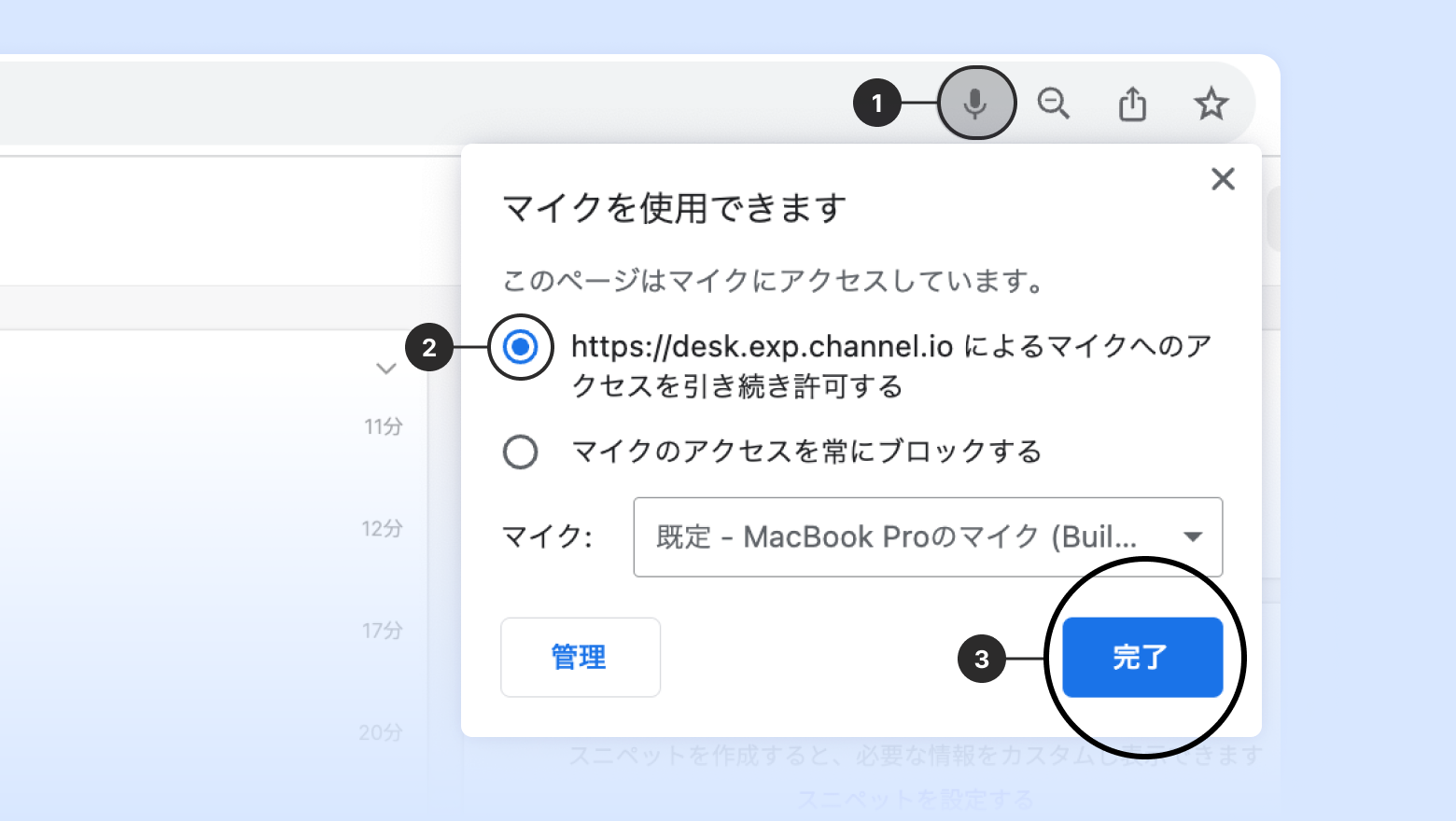 [Webサイト] - [マイク] でチャネルトークアドレス(channel.io)に対して権限を許可してください。