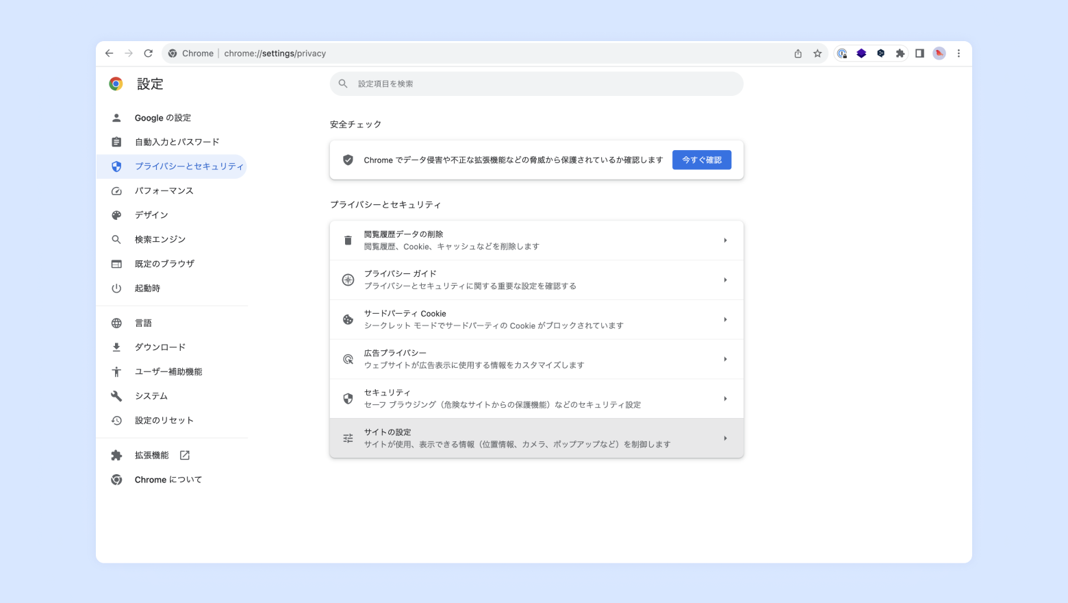 [プライバシーとセキュリティ] - [サイトの設定] にアクセスします。