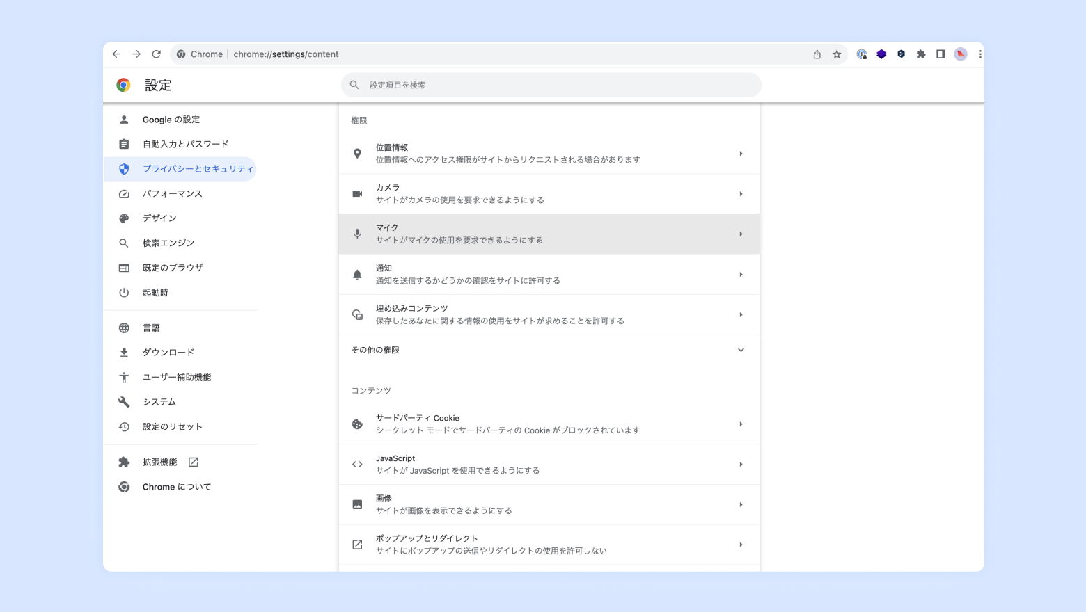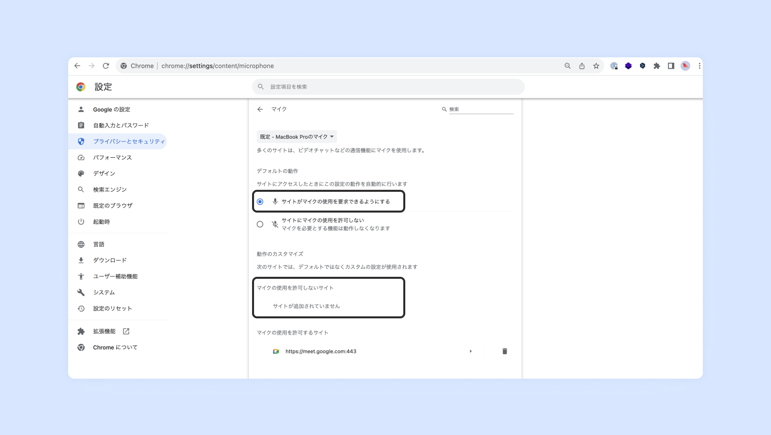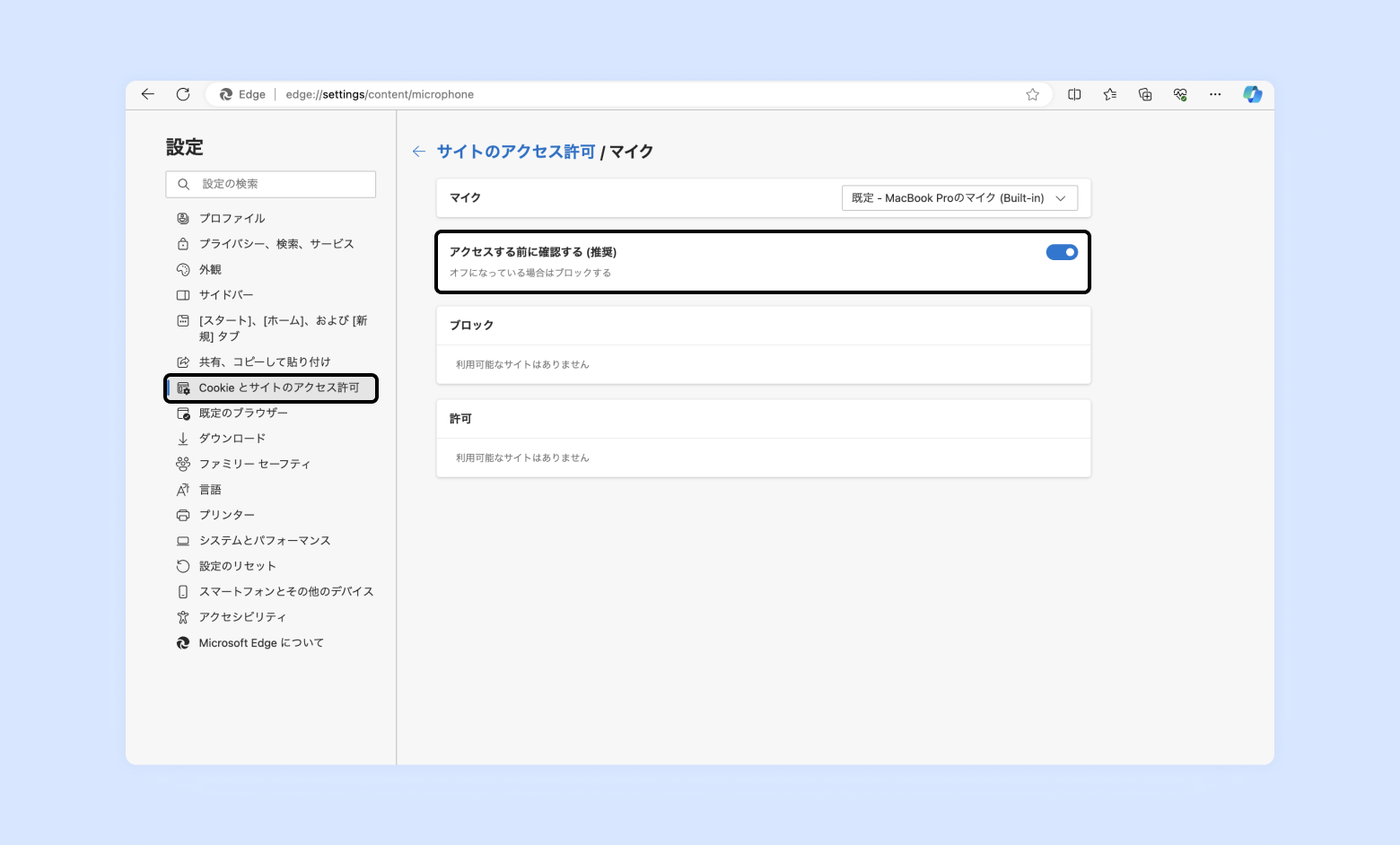 [Cookieとサイトのアクセス許可] - [マイク] - [アクセス前に確認する(推奨)] をONにしてください。