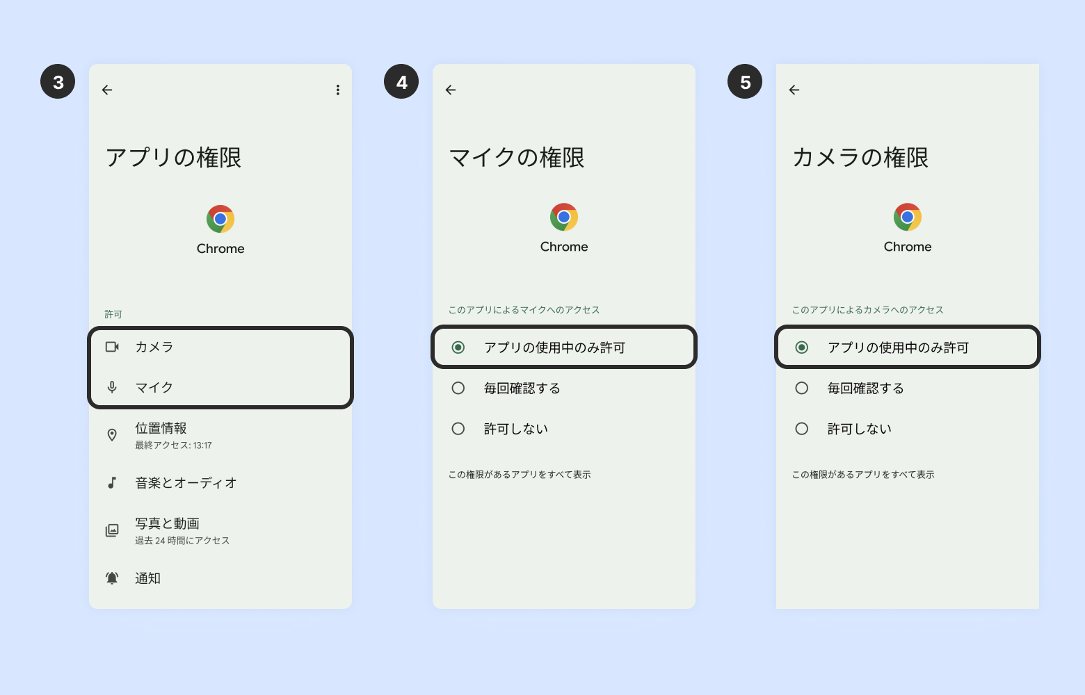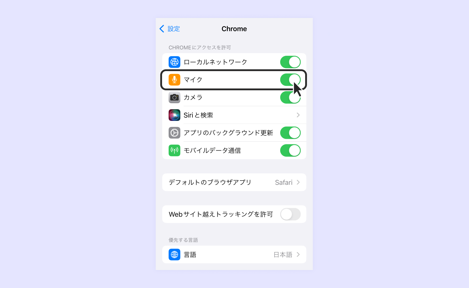 [設定] - [アプリ] - [使用するブラウザアプリ] - [権限] - [マイク] を選択後、 [マイクへのアクセス] を許可してください。