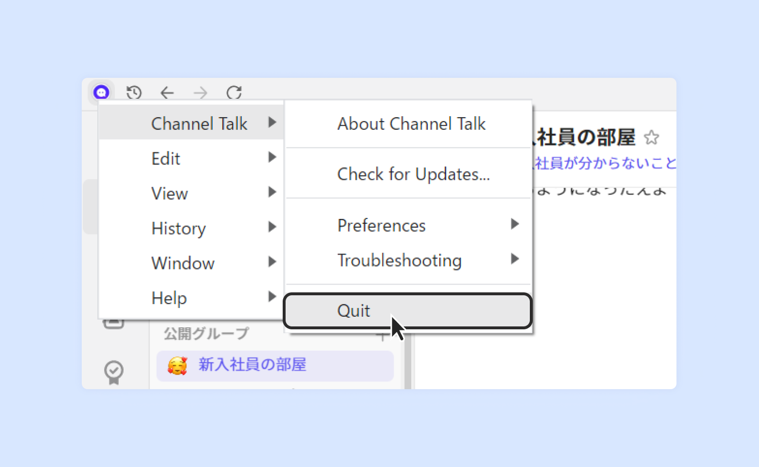 設定後、Channel Talkアプリを再起動すると権限が適用されます。 [チャネルトーク管理者プログラムの左上のアイコン] - [Channel Talk] - [Quit]