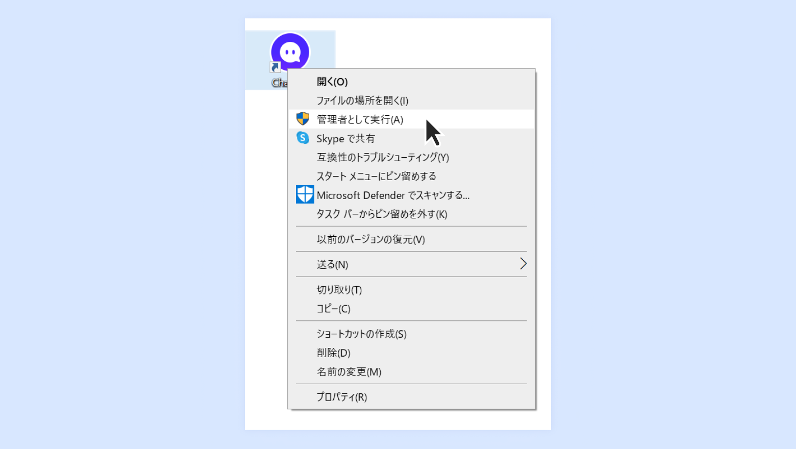 [デスクトップ] - [チャネルトークアプリを右クリック] - [管理者として実行]
