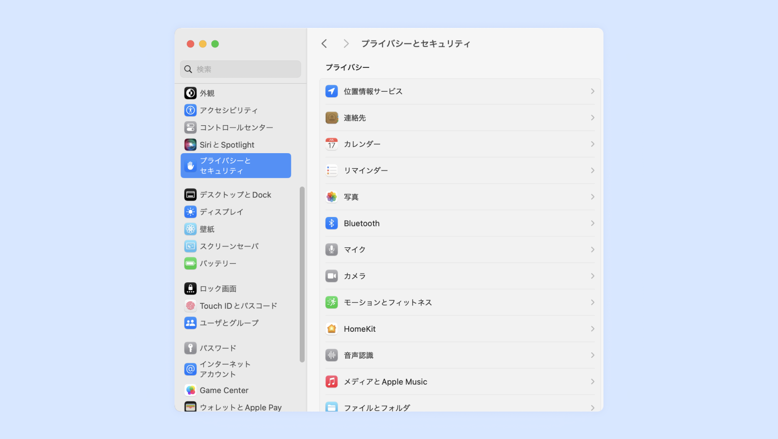[システム環境設定] - [プライバシーとセキュリティー] - [マイク] を選択します。