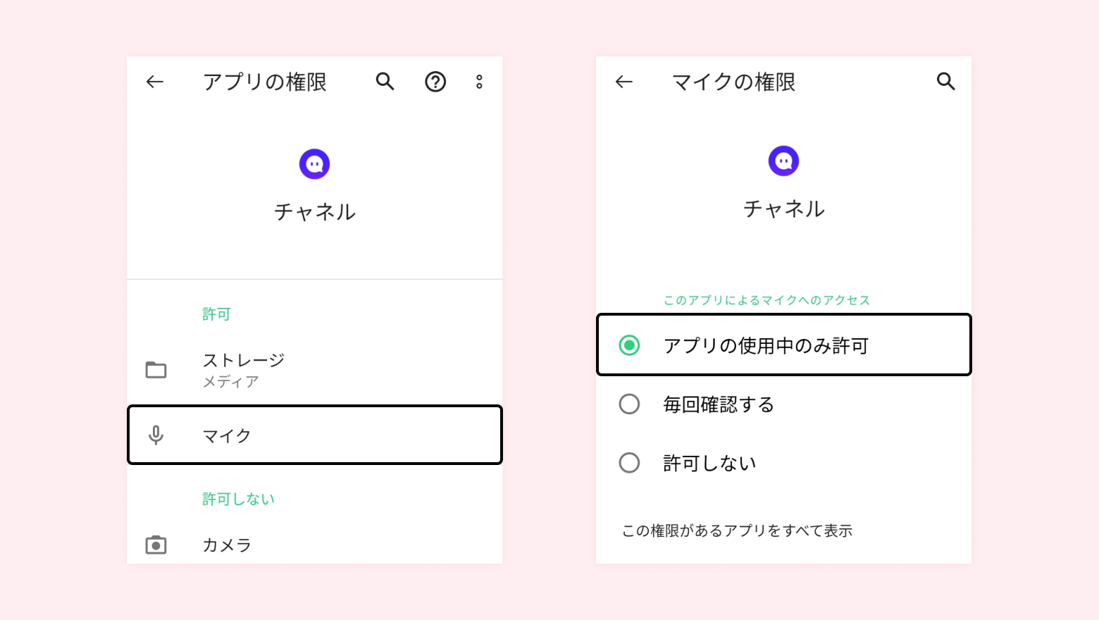 [設定] - [チャネルトーク] を選択後、マイクの使用権限をONにします。