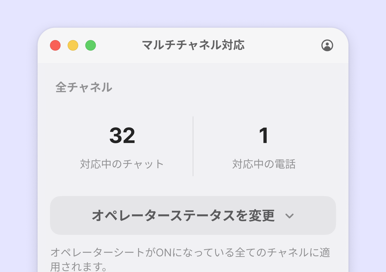 2つ以上のチャネルに参加している場合、マルチチャネル対応をお使いになれます。マルチチャネルのウィンドウで現在対応中のチャットと電話の数、どのチャネルで何件問い合わせが対応中なのかを一目で確認できます。