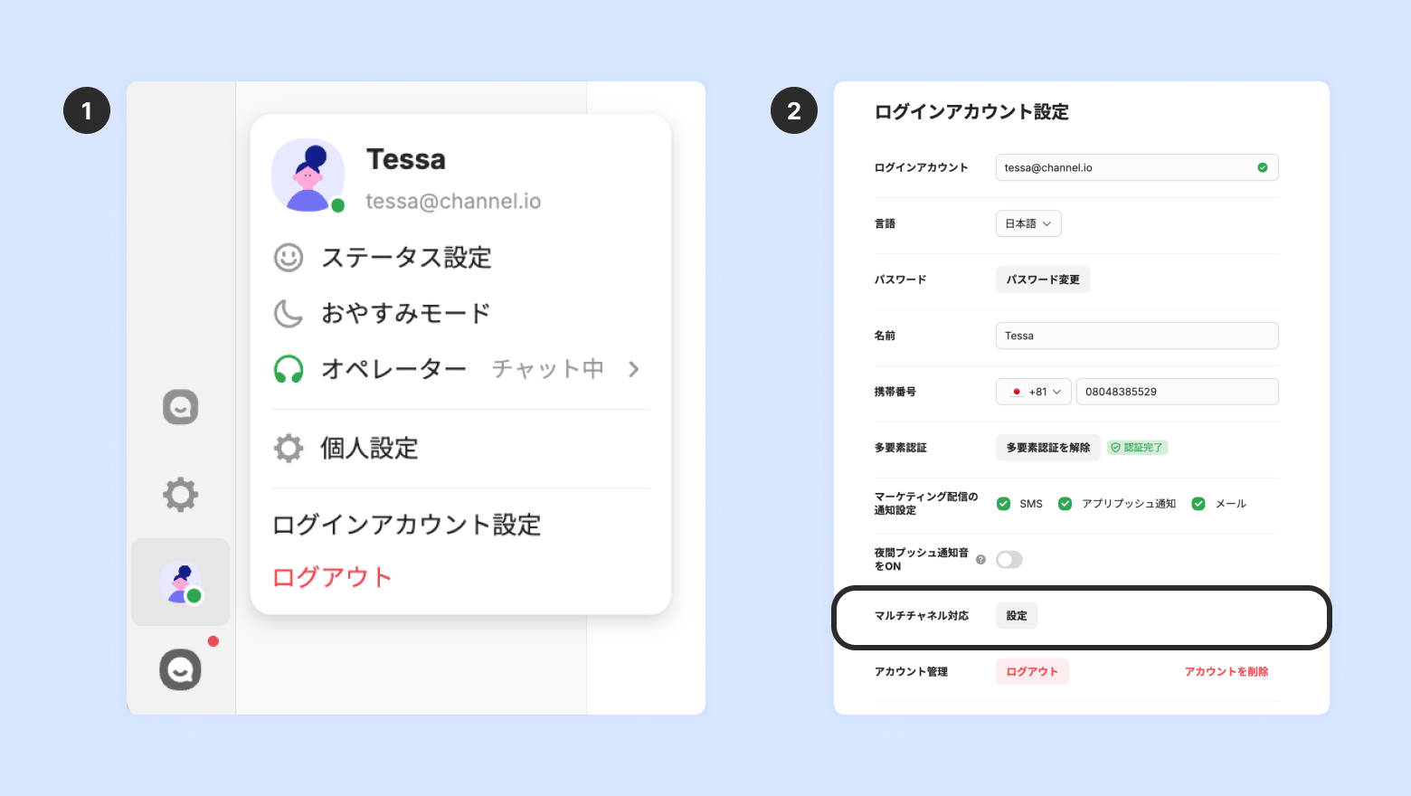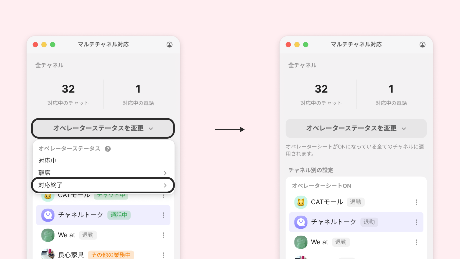 マルチチャネルでオペレーターステータスを変更すると、自分が参加している全てのオペレーターステータスを変更できます。