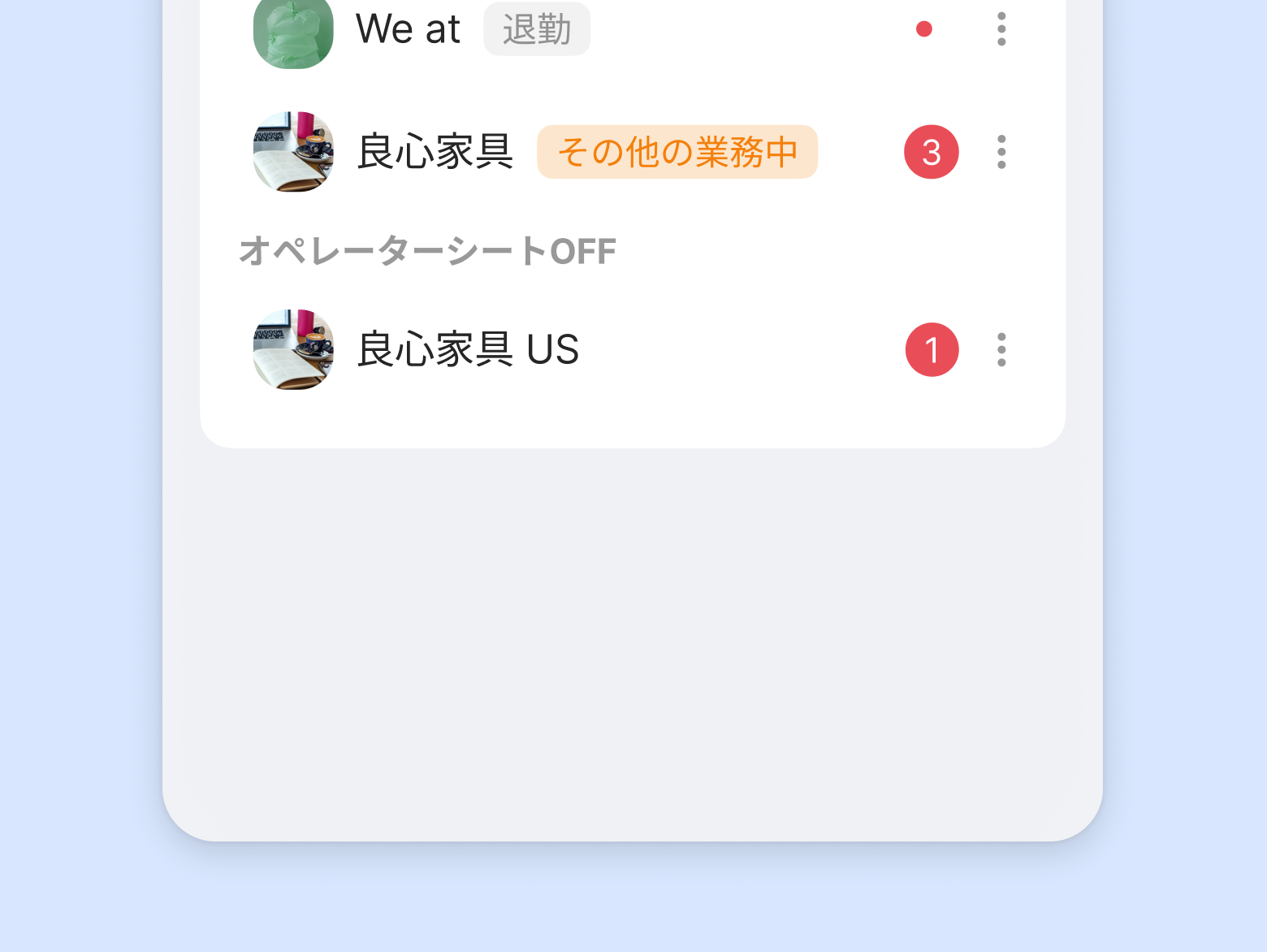 チャネルリストの右側の [もっと見る(⋮)] をクリックし、チャネル別のオペレーターステータスと通知の種類を設定できます。