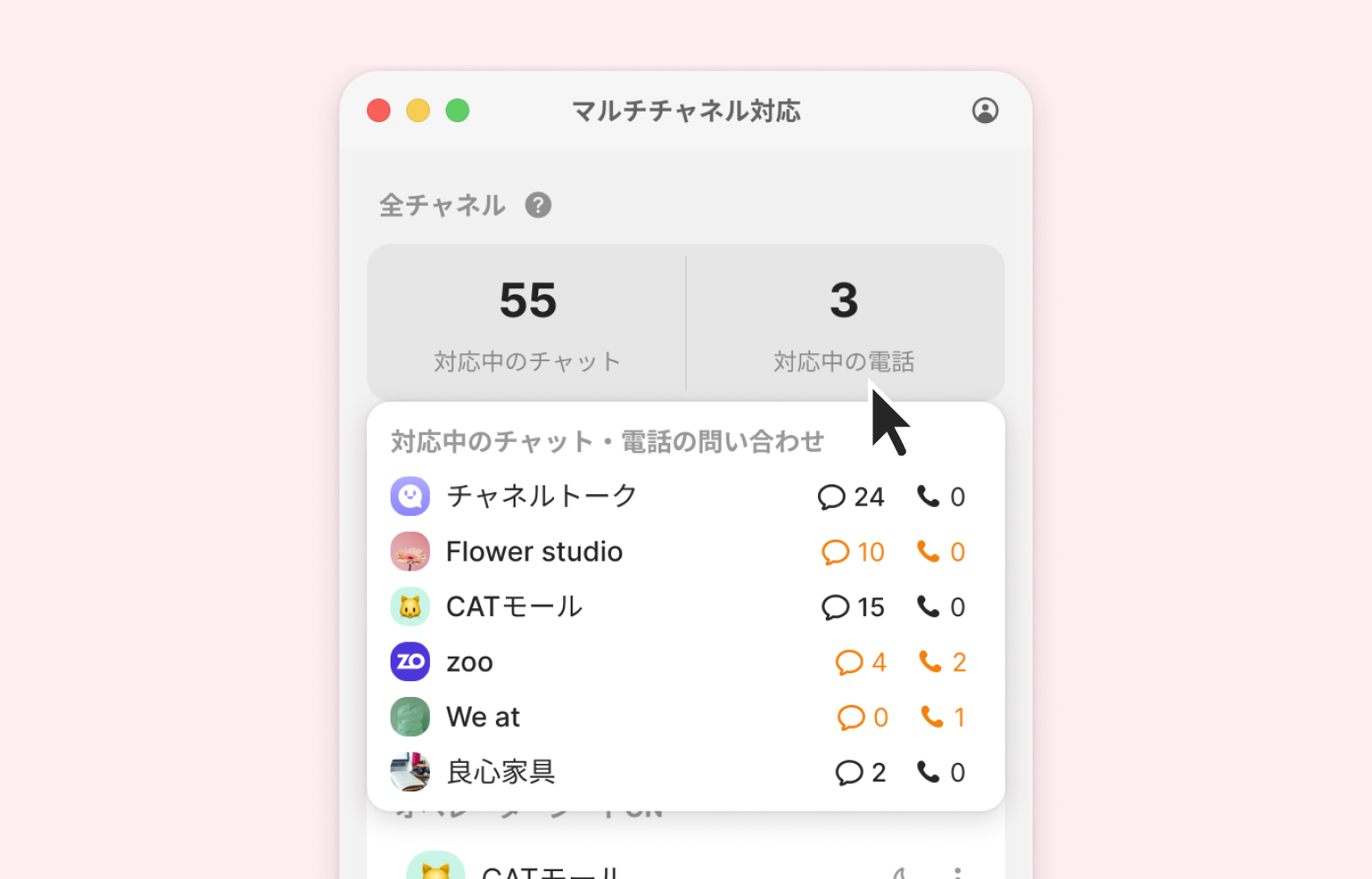 参加している全てのチャネルで対応中の問い合わせ数を確認することができます。チャットと電話の問い合わせを分けて確認することができ、クリックするとチャネル別に対応中の問い合わせの件数を見ることができます。